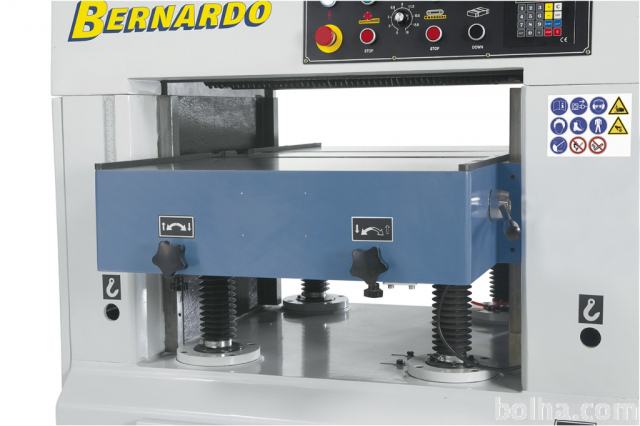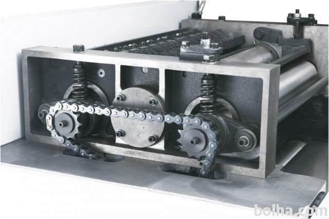 IZREDNO MASIVNA KONSTRUKCIJA STROJA 1250 kg OB SEGMENTNEM VSTOPNEM VLEČNEM VALJU, 2-ma kom GNANIH RAZBREMENILNIH VALJIH V PLOŠČI DEBELINKE IN VARIATORSKEM POMIKU VLEČNIH VALJEV, ZAGOTAVLJA POPOLNOMA MIREN TEK STROJA, ODLIČEN VLEK OBDELOVANCA IN VRHUNSKO OBDELAVO.
