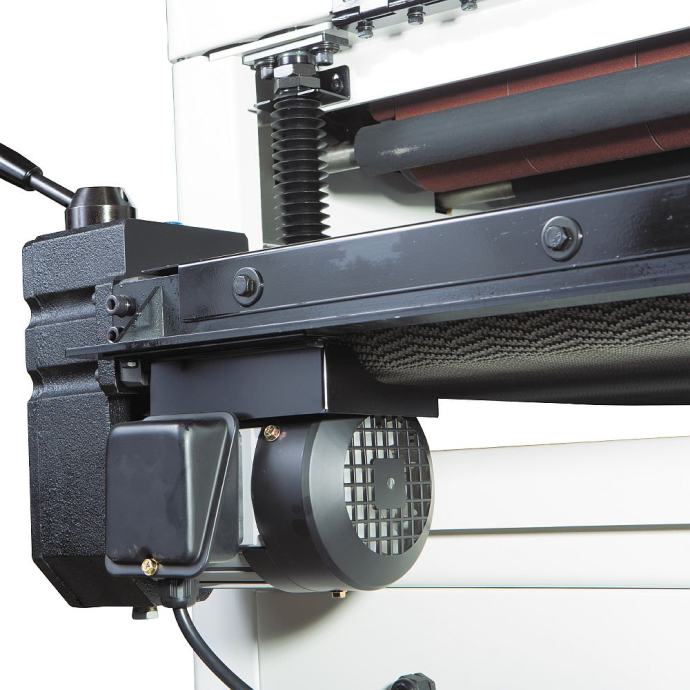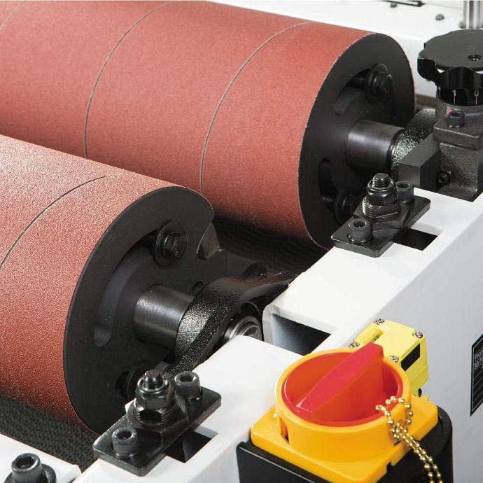 Dvojni valjčni brusilnik ponuja trdno in masivno konstrukcijo z zmogljivim motorjem. Dva 150 mm brusna valja sta narejena iz natančno litega duraluminija in sta tudi popolnoma uravnotežena in prevlečena z gumo. Zagotovil bo popoln končni zaključek samo z enim prehodom. Sprednji valj je opremljen z grobo brušenjem za učinkovito skobljanje, medtem ko je zadnji valj opremljen z mikro nastavitvijo, ki omogoča nastavitev drugačne višine kot na sprednjem, kar zagotavlja lep zaključek. Brusilni trak s širino 75 mm ali 100 mm je spiralno navit na valj in ima pametne sponke, ki omogočajo hitro in enostavno menjavo abraziva. Gumirani sodi zagotavljajo kakovostno pritrditev brusnega traku.