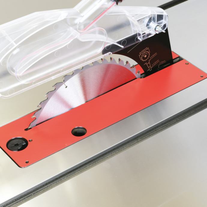 Prva stvar, ki bo pritegnila vašo pozornost, je velika miza iz litega železa. Miza ponuja veliko prostora za določanje velikosti večjih kosov. Robustna ograja zlahka drsi po površini žage in je opremljena z mehkim plastičnim ročajem, ki varno zaklene ograjo v katerem koli položaju. Nastavljiva lestvica je lahko berljiva zahvaljujoč lupi. Aluminijasti profil ograje za tanjše operacije lahko obrnete za 90 stopinj. Povečevalno steklo ima dve črti, ena prikazuje razdaljo plošče od profila ravnila, ki je v standardnem navpičnem položaju, druga pa prikazuje oddaljenost plošče, če je profil ravnila zasukan za 90° v vodoravni položaj. Miza ima dve priročni T-reži za zajeralno ograjo na obeh straneh rezila.