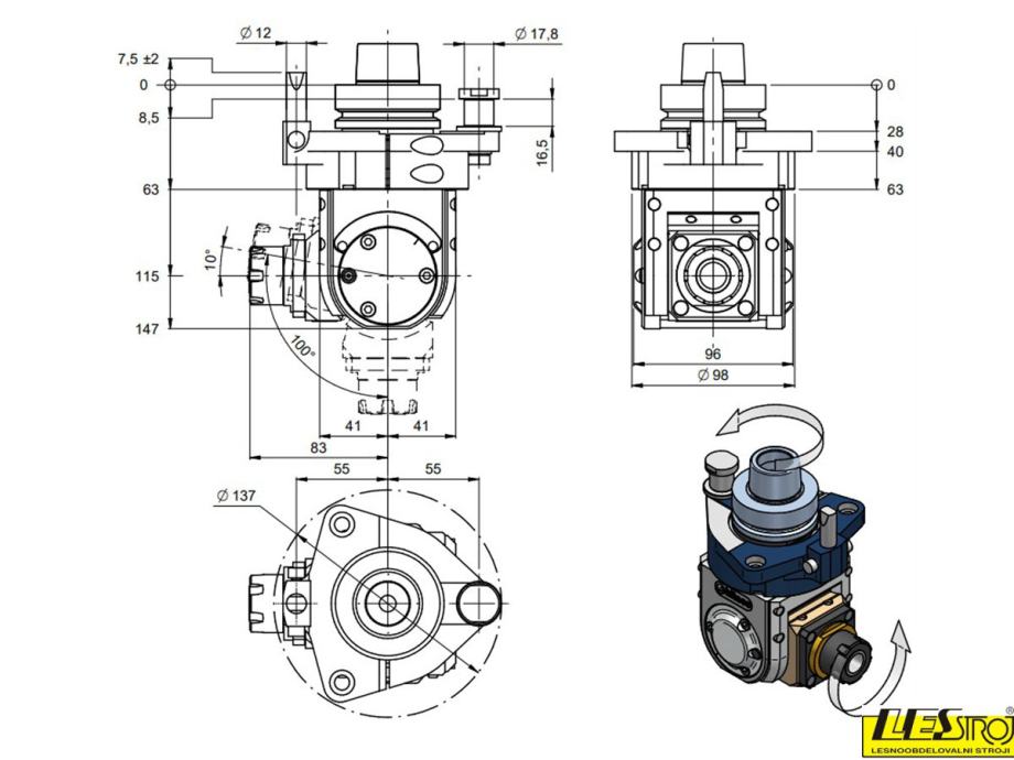 HITECO kotni agregati so izredno natančni. Namenjeni so horizontalnemu vrtanju, rezkanju ali žaganju. V standardni konfiguraciji se pritrdijo z HSK63-F konusom, na strani kjer se namesti orodje pa je ER32 puša.