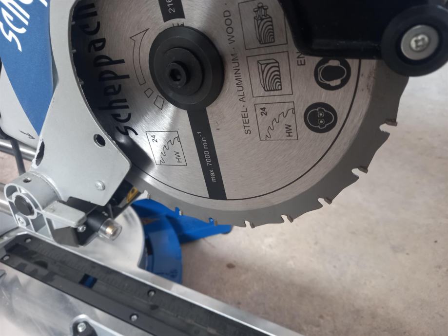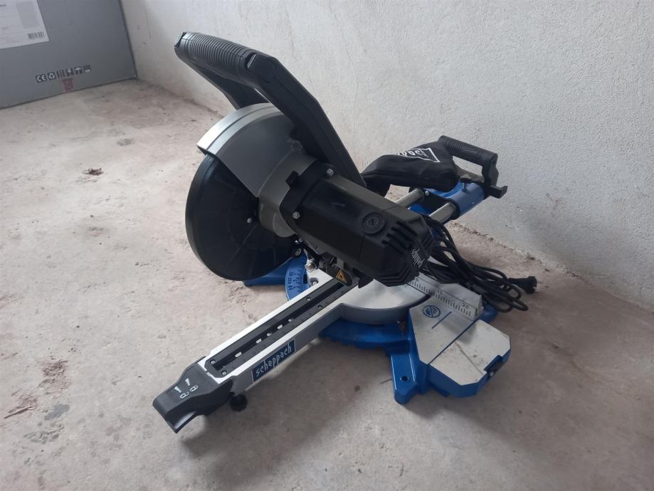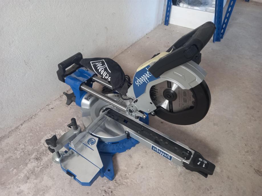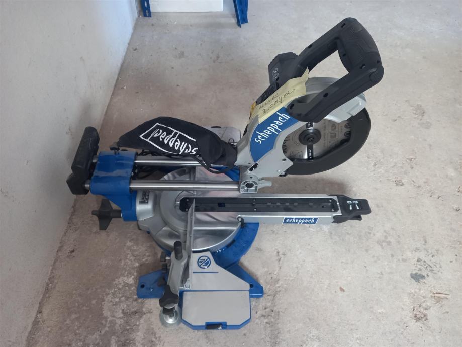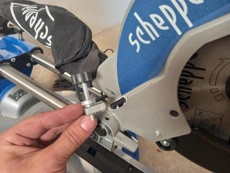 Potezna zajeralna žaga Scheppach HM90MP je nova, vendar je poškodovana - odlomljeno omejevalo za nastavitev delavne globine oziroma spodnjega limita žagalnega lista. Odlomljen del je zraven in priložen (vidno na zadnji sliki).