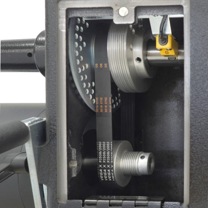 Trdno ležišče z impresivno širino 208 mm je izdelano iz visokokakovostnega jekla in je natančno brušeno, kar zagotavlja nemoteno premikanje glave, zadnjega dela in naslona za orodje. Vreteno poganja visoko učinkovit 2,2 kW indukcijski motor s frekvenčnim pretvornikom VFD za visok navor tudi pri nižjih vrtljajih. Hitrost je gladko nadzorovana z gumbom iz duraluminija, prestave pa je mogoče menjati s pametnim mehanizmom z eno ročico.