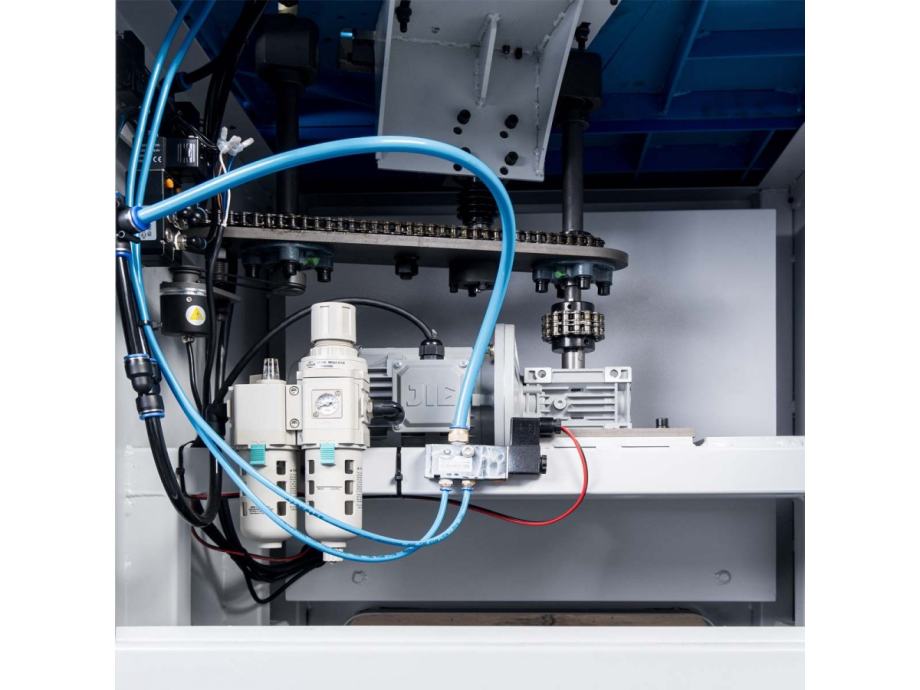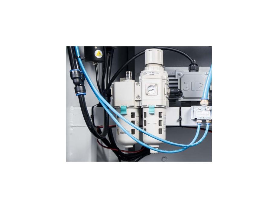 Enota za pripravo zraka z separatorjem vlage in oljnikom za avtomatsko mazanje celotnega pnevmatskega sistema stroja.