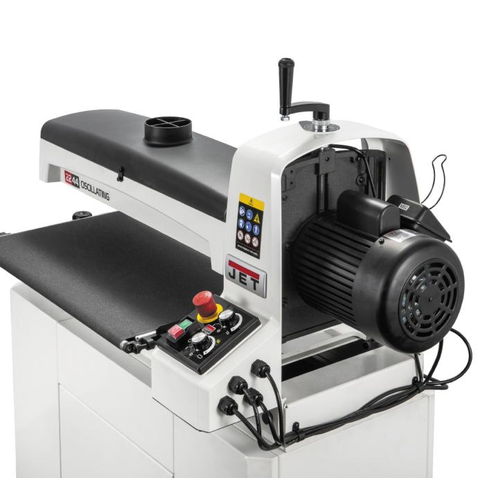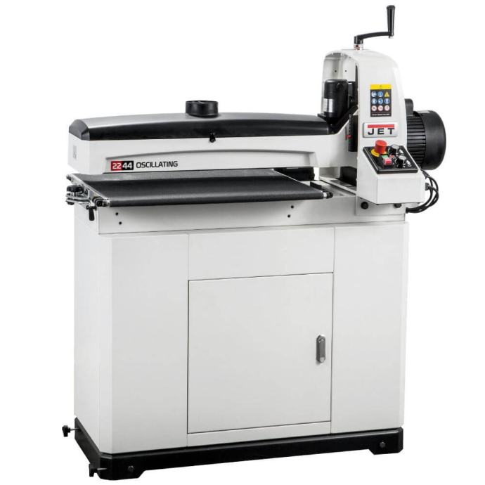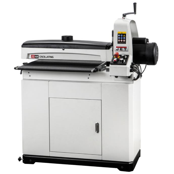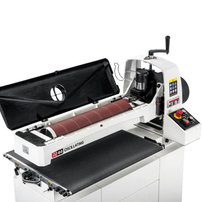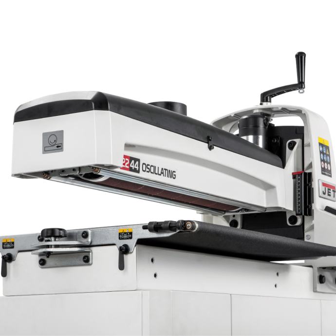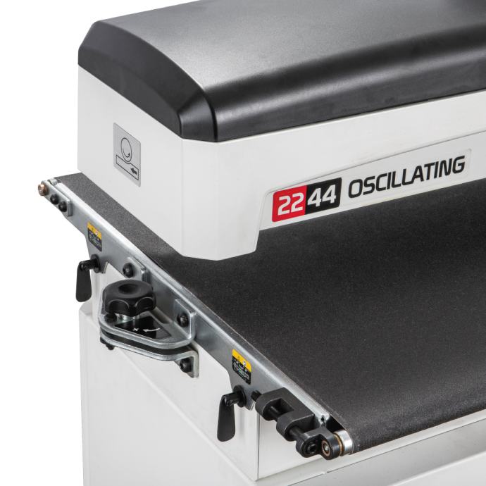 Novi JET 2244OSC oscilacijski bobnasti brusilnik je zasnovan za fino brušenje, izravnavo in druga dodelavna dela. Dvojni prehodi lahko obdelajo neverjetnih 1120 mm širokih in 100 mm debelih obdelovancev. Boben je posebej uravnotežen, da zmanjša vibracije. Nihajno delovanje zagotavlja gladko površino in podaljša življenjsko dobo brusilnih trakov. Velika prednost je regulacija hitrosti podajanja s 3 metri na minuto na nič in zaustavitev za popoln zaključek. Dober zaključek je mogoče doseči tudi na najtežjih lesenih kosih.