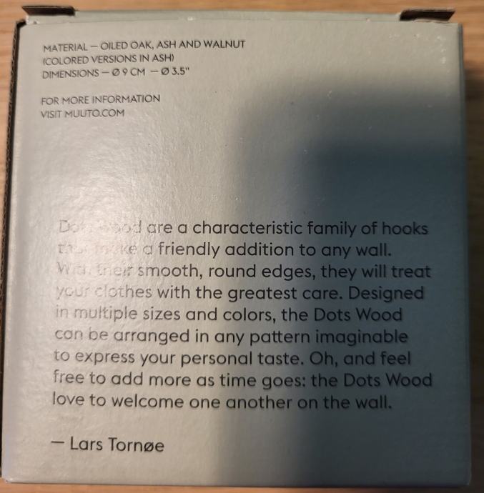 Zaradi napacnega nakupa prodam v original embalazi, popolnoma nov obesalnik Dots Wood MUUTO, made in Slovenia, design Denmark. Cena 1kom 20€. Premer kroga 9cm. Prevzem v NG in njeni okolici.