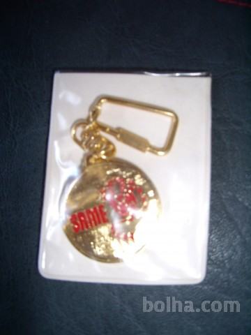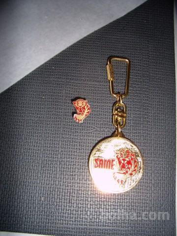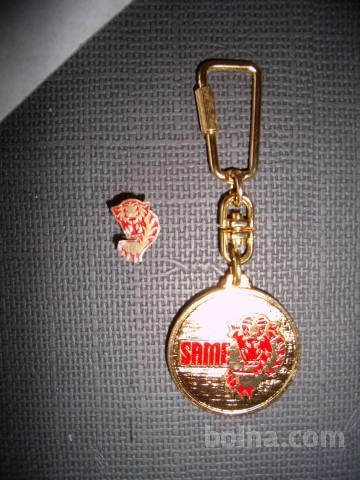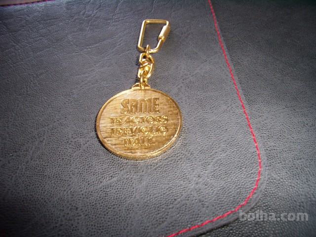 Prodam pozlačen kovinski obesek za ključe SAME, masiven, okrogle oblike, z rdečim vtisom tigra – logotipom SAME, in napisom SAME na eni strani in vtisnjenim napisom SAME TRACTORS TREVIGLIO ITALY na drugi-, s kvalitetnim vrtljivim karabinom.