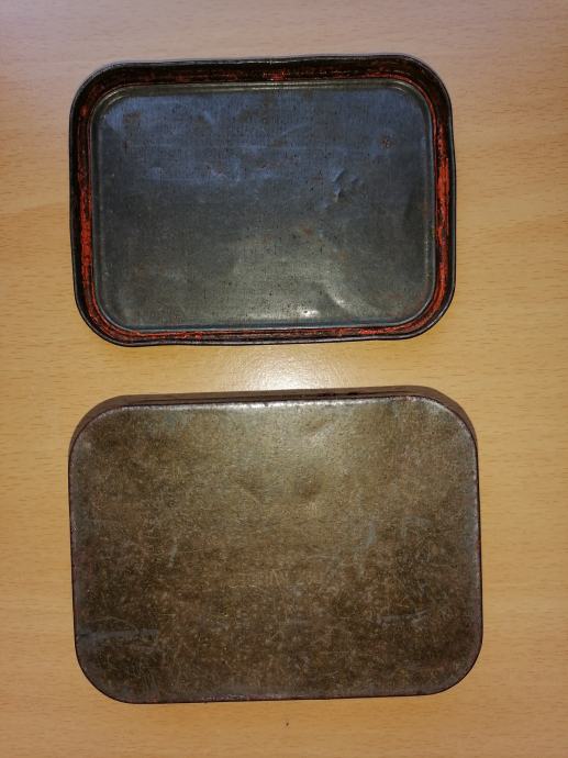 Iz kovine.Nekoč je bil v njej pribor,za čiščenje ali nego čevljev.Na pokrovu škatlice je veliko napisanega v črni barvi,v angleščini,ki ga je zaradi starosti nekaj zbledelo.Ima graviran napis v škatli in na zunanji strani ,na dnu.Namenjena je za zbiratelje starin.Njene mere: dolžina 11cm,širina 8cm,višina 2,5cm.Tel.064 222 880,pošljem po navadni pošti ali osebni prevzem.
