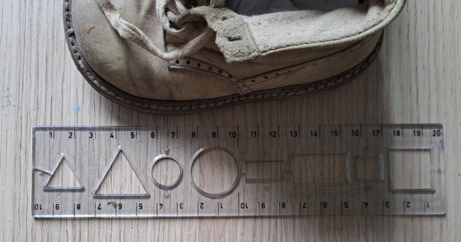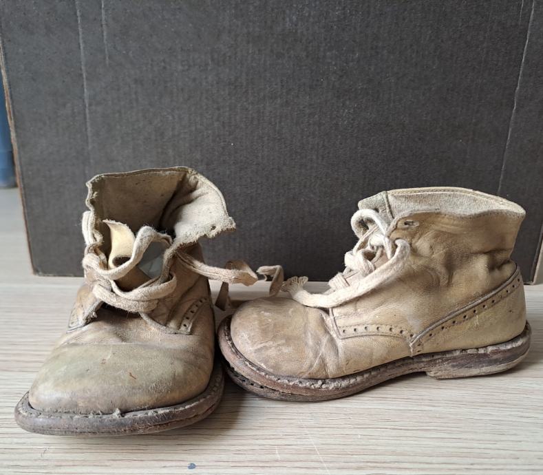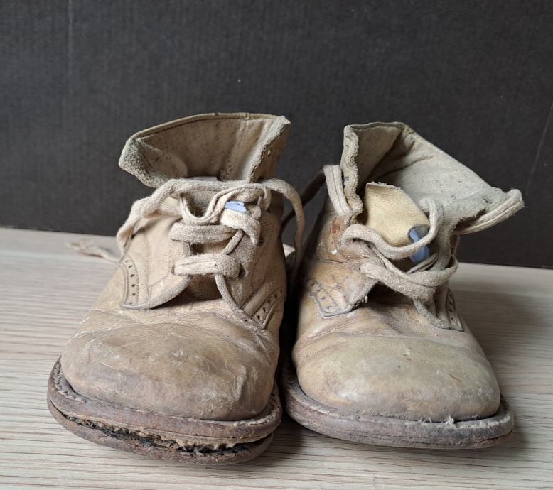 Starinski otroški čeveljčki, najverjetneje najmanjša številka, torej prvi čeveljčki.