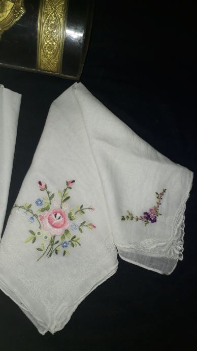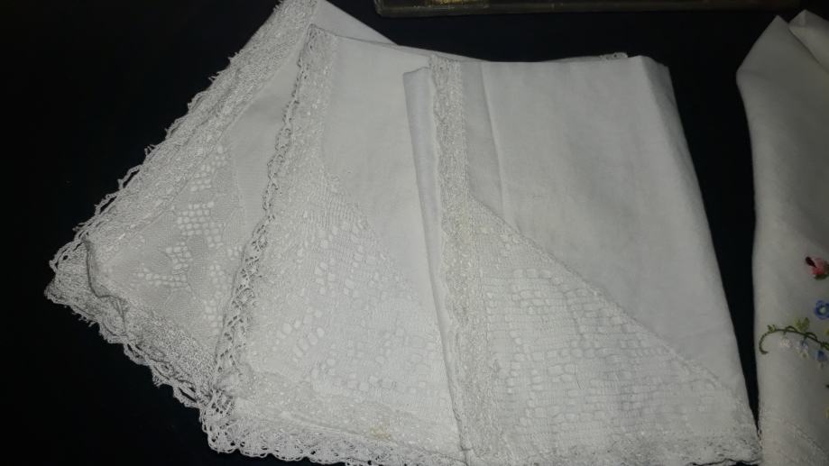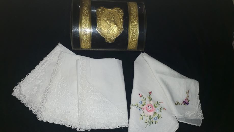 Vintage tekstilni robčki ( 5 kom. ), iz tankega platna, 3 imajo v enem kotu čipko, 2 imata čipko in vezenino, v lični škatlici. Lahko je prekrasno darilo za nekoga, ki ceni starine.