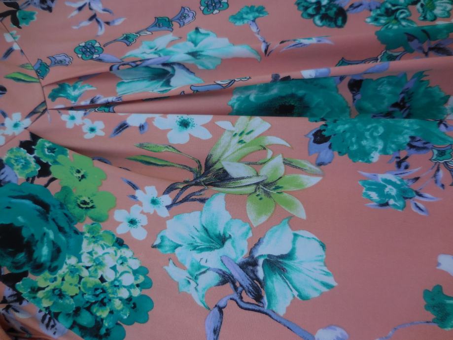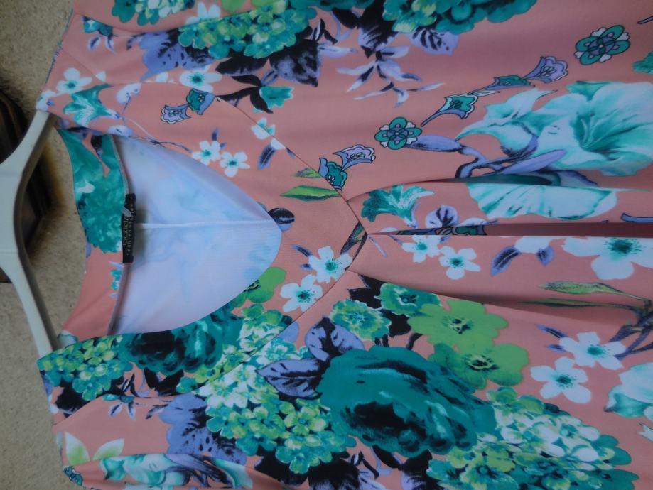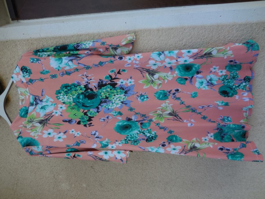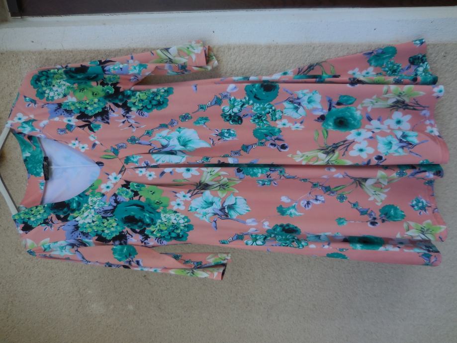 Čudovita nova poletna obleka, marelične barve z zelenim cvetličnim vzorcem, široko krojena, s 3/4 rokavi, je podložena s tanko podlogo in je raztegljiva.
