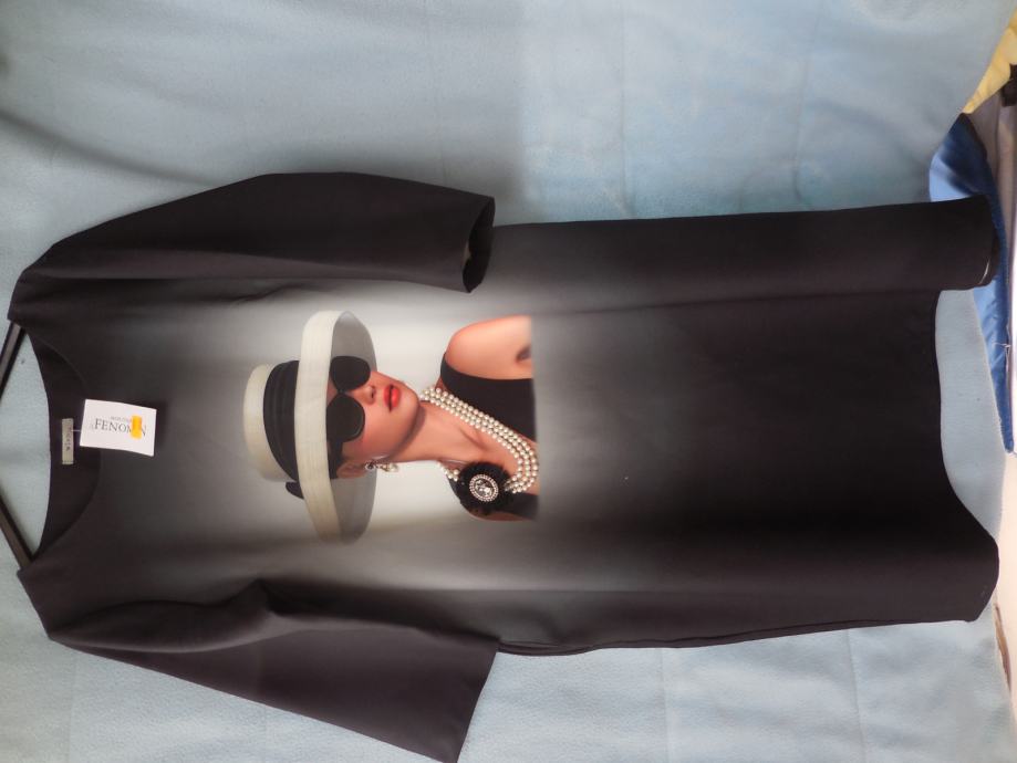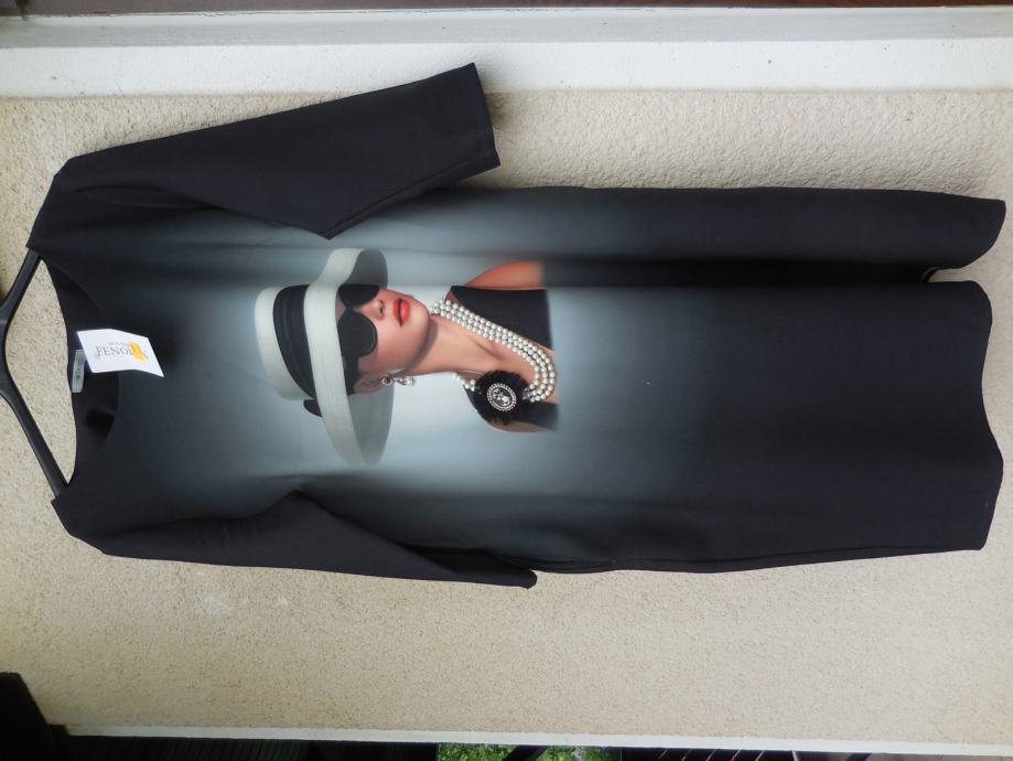 Nova črna obleka z etiketo s čudovitim potiskom ženskega obraza. Obleka je krojena ravno, ob strani ima dva žepa, zapenja se ob strani na zadrgo, ni podložena in je malenkost raztegljiva, primerna tudi za velikost 46. Originalna cena je bila 49,00€...