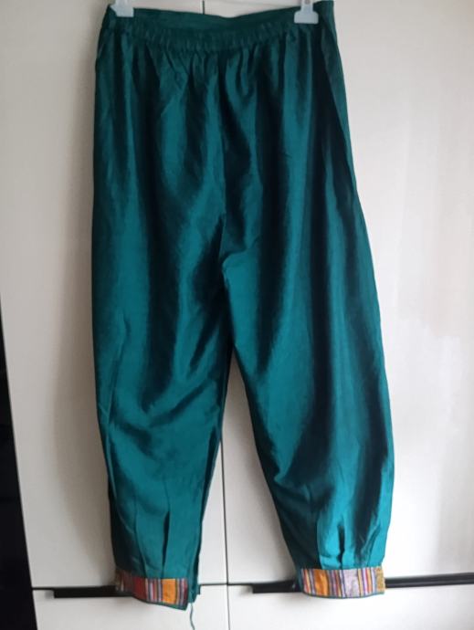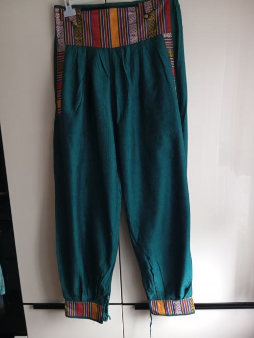 Nikoli nošene bombažne, niso raztegljive, v pasu imajo na zadnji strani elastiko in merijo od 40 do max 50cm, boki so 63cm, od razkoraka do pasu je 45cm, dolžina je 105cm, ne menjam, ptt ni vključena v ceno