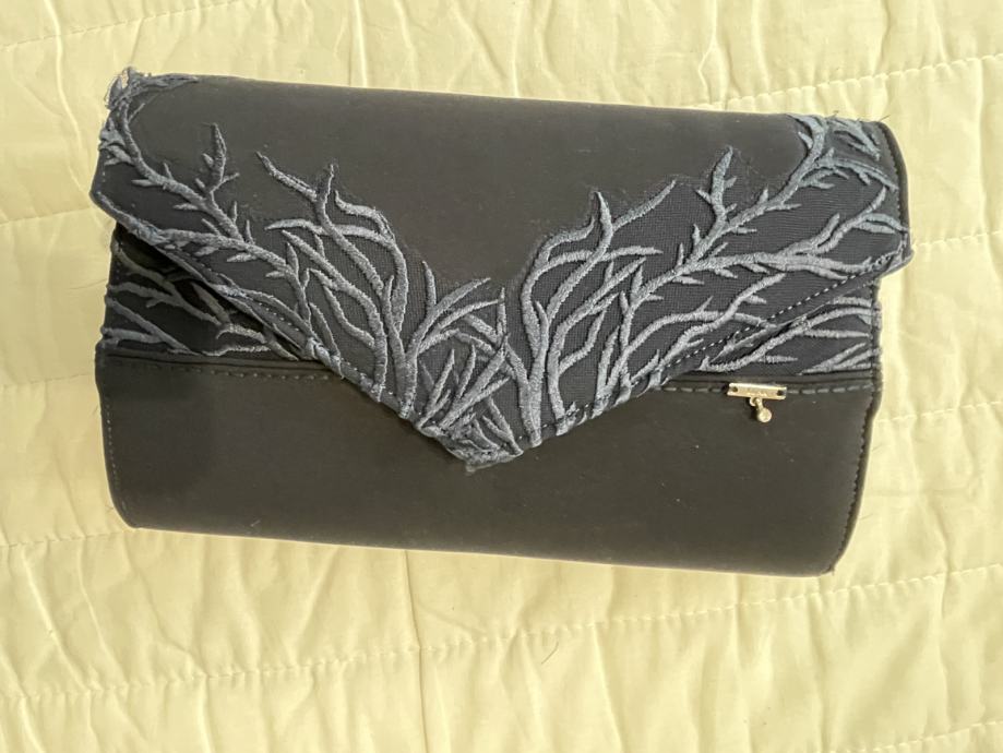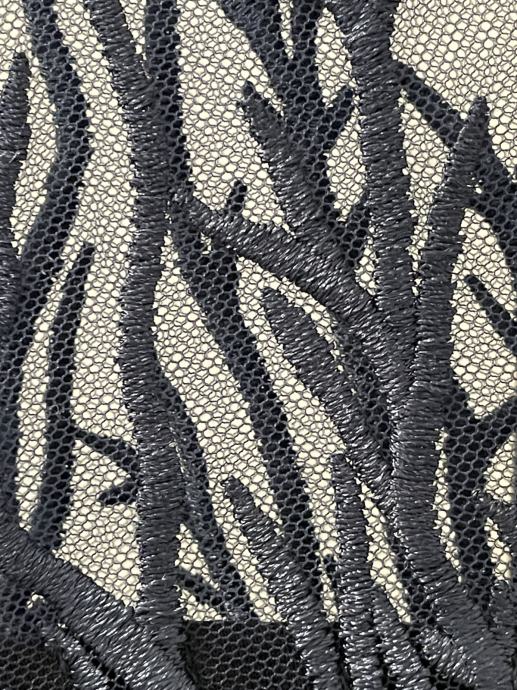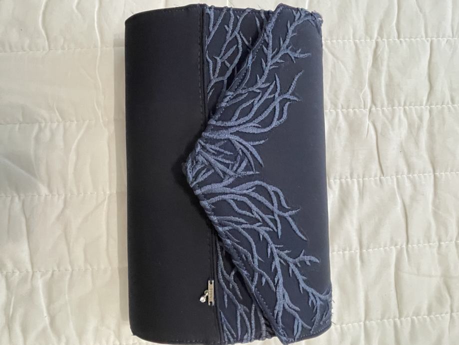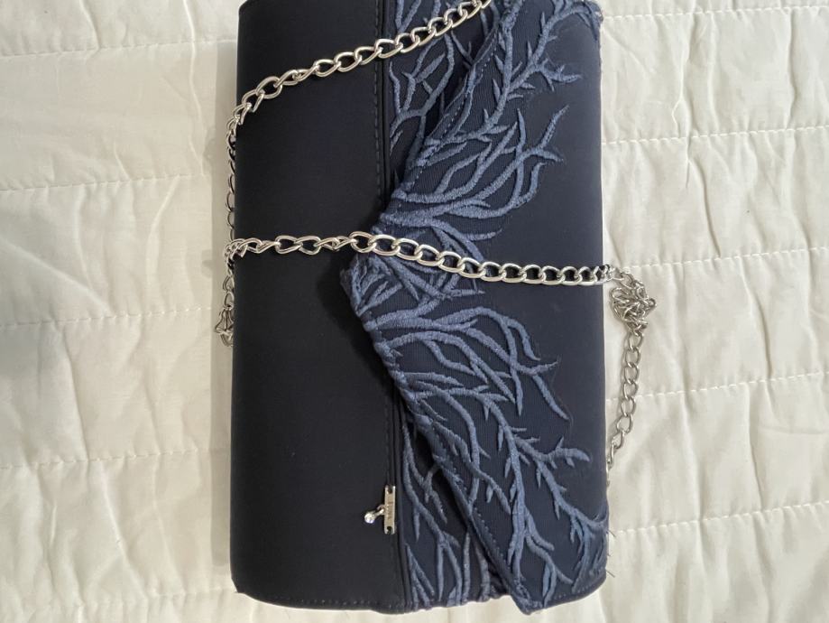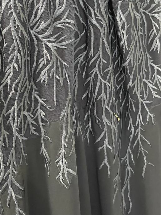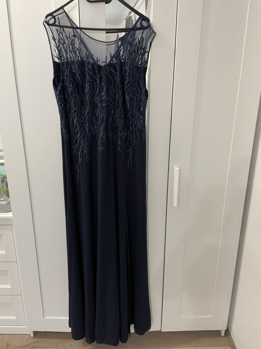 Temno modra, enkrat nosena , svecana obleka, podlozena, izredno kvalitetno sivana in s torbico iz enakega blaga. Zadaj je skrita zadrga, sprednji del v delu prsi je prozoren oz. Nepodlozen. Dolzina od ramen do tal je cca155cm, sirina pasu je cca 100 cm. S srebrnim kamenckom - v barvi diamnta, na obleki in torbici. Res vredna nakupa in kot nova.