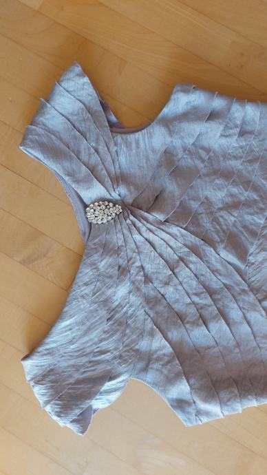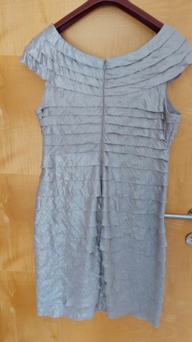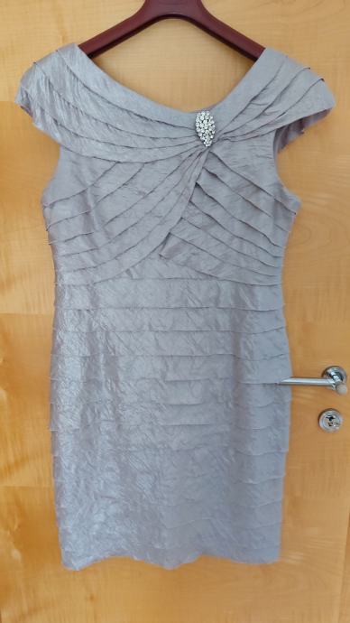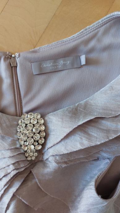 Svečana obleka z broško Christian Berg, rahlo telirana, material prožen, barva losos, 2x oblečena, kot nova, zapenjanje z zadrgo na hrbtu, cena nove je 150 eur