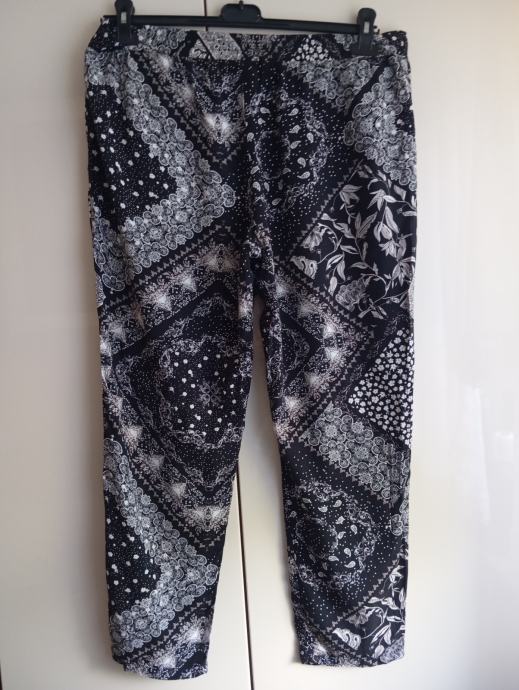 Izredno lepo ohranjene, viskozne, niso raztegljive, ob strani imajo 2 žepa, v pasu imajo elastiko in merijo 45 do cca 54cm, od razkoraka do pasu je 30cm, dolžina je 93cm, ne menjam, ptt ni vključena v ceno