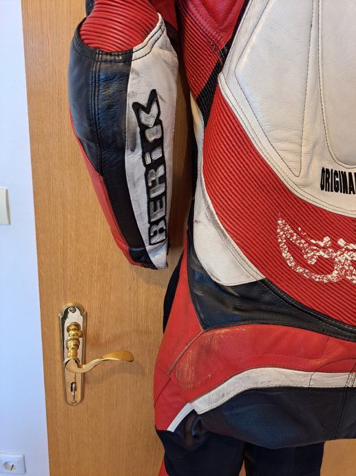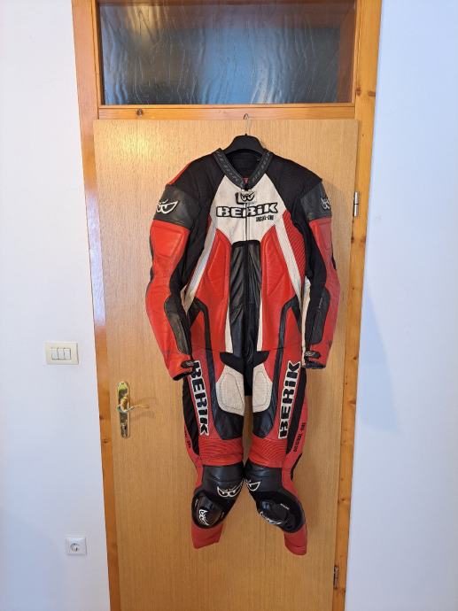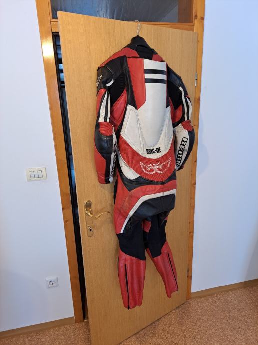 Lepo ohranjen, velikost 52, za velikost do 180, in teža do 85kg. Malo podrsan na boku in levem komolcu kot se vidi na sliki.