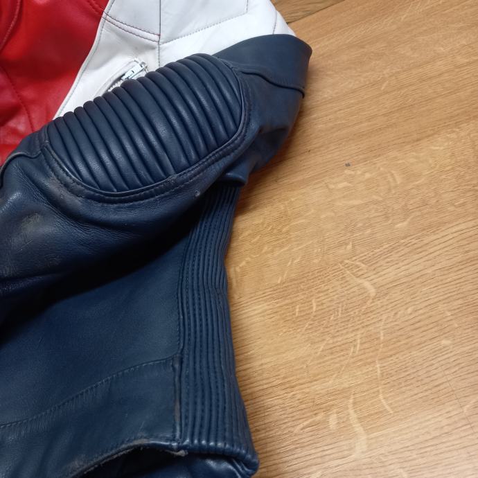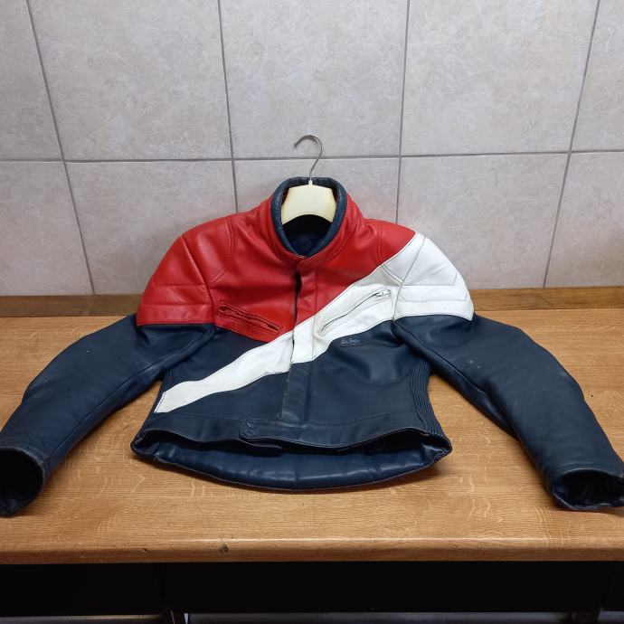 Absolutna raritete z podpisom dvakratnega svetovnega prvaka.Kos oblačila katerega bo vesel vsak starodobničar. Še vedno zelo mehko in kompaktno usnje z elastičnimi vložki in ojačitvami na pregibih. Velikost M,pa brez trebuha. Lep kos.