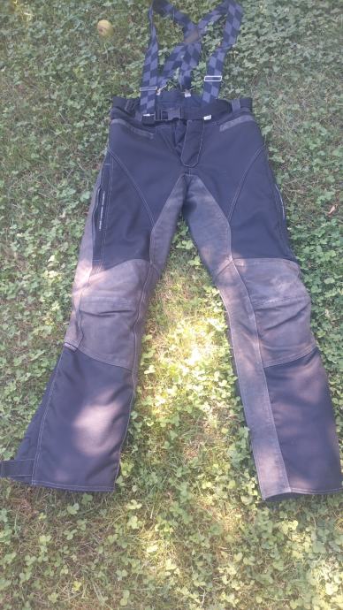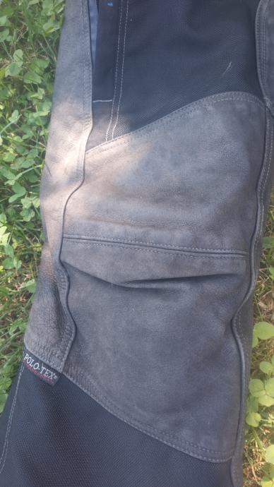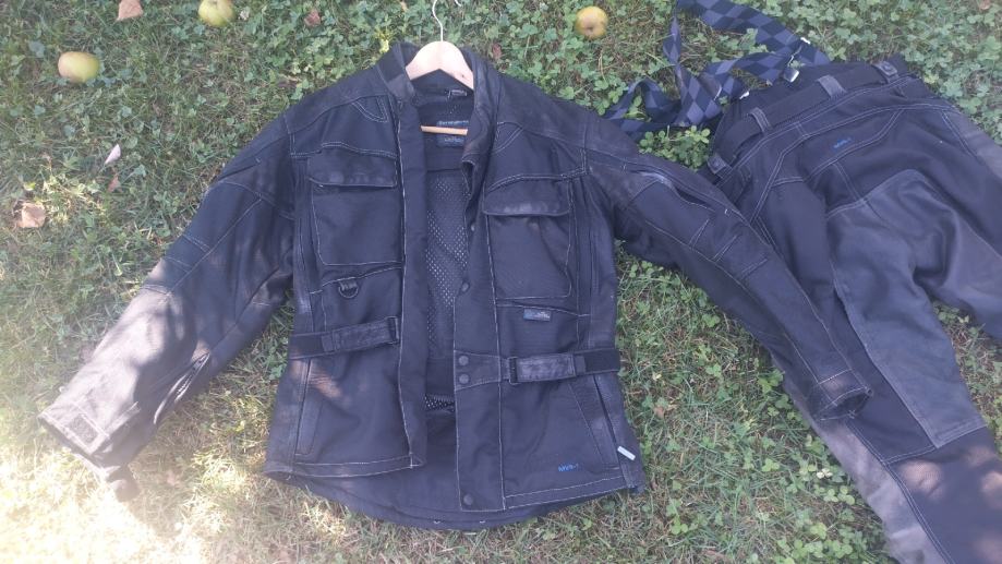 Hlače zašite na levem kolenu, vendar nič hujšega. Jakna in hlače razen omenjene napake lepo ohranjene. Nošeno le par sezon, vredno nakupa. Material cordura in usnje. V hlačah kolenski ščitniki, v jakni kolmolčni in za hrbet. Nemška kvaliteta, vredno nakupa.