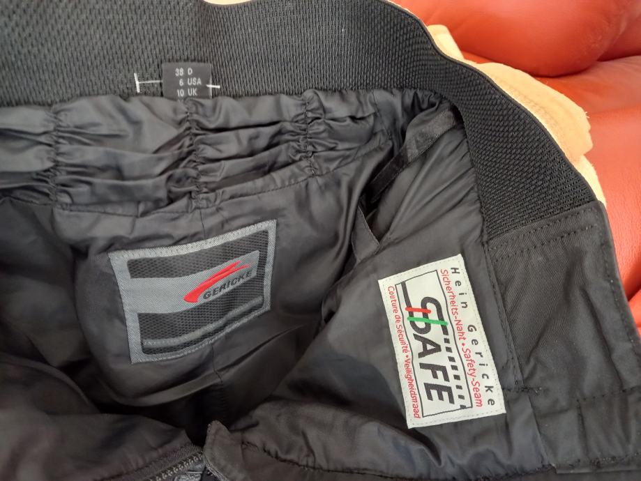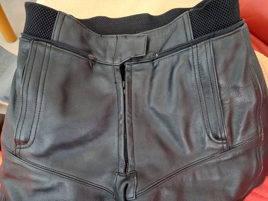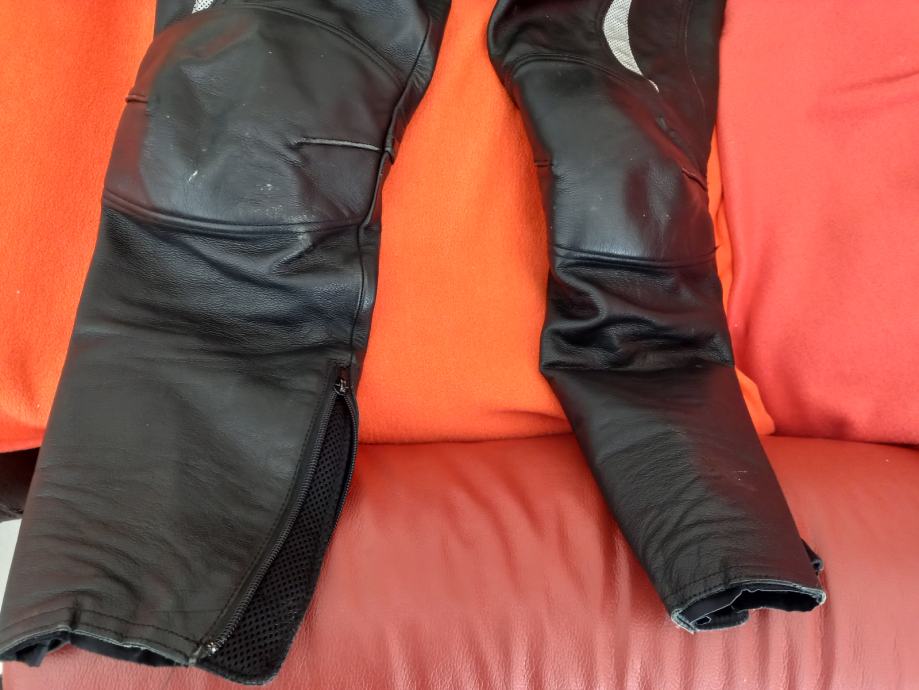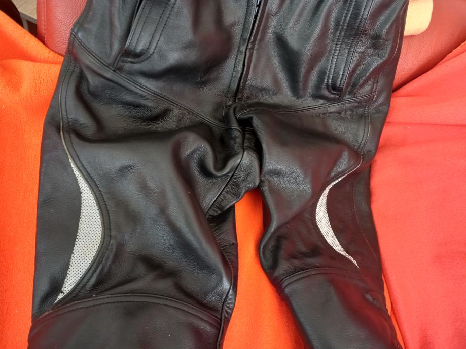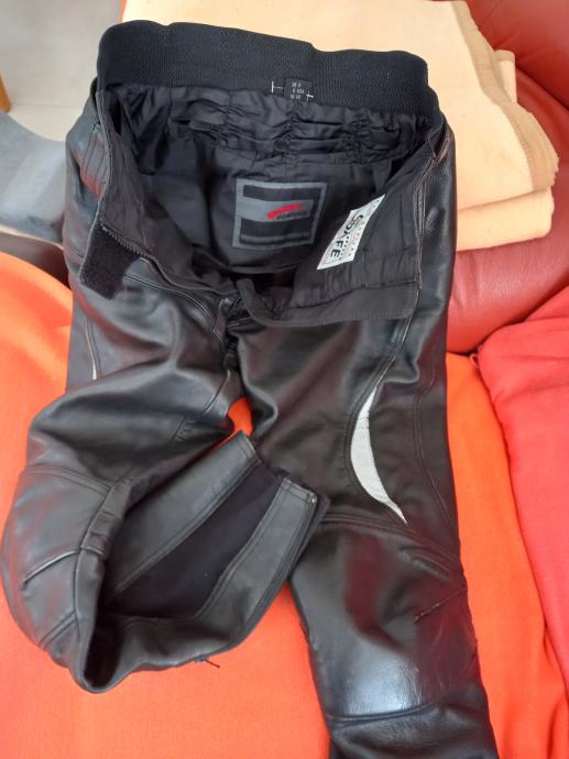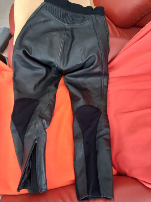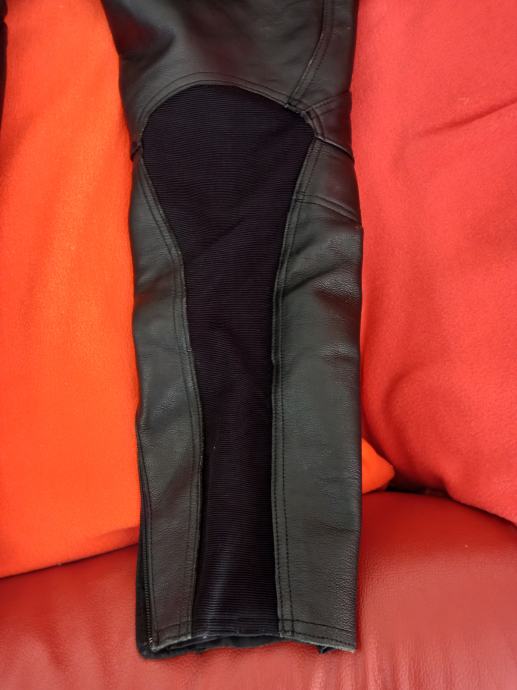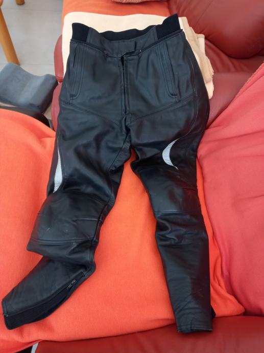 OHRANJENE - ČRNE BARVE Z ŽEPI ; USNJE V KOMBINACIJI PREGIBNIH DELOV Z TEXTILOM, ZATO SO TUDI KLJUB USNA MEHKE - so iz srednje debelega usnja, ( pas cca.38 cm in dolžine v razkoraku cca, 72cm ) SO ZELO PRIMERNE TUDI ZA DOLGE VOŽNJE...