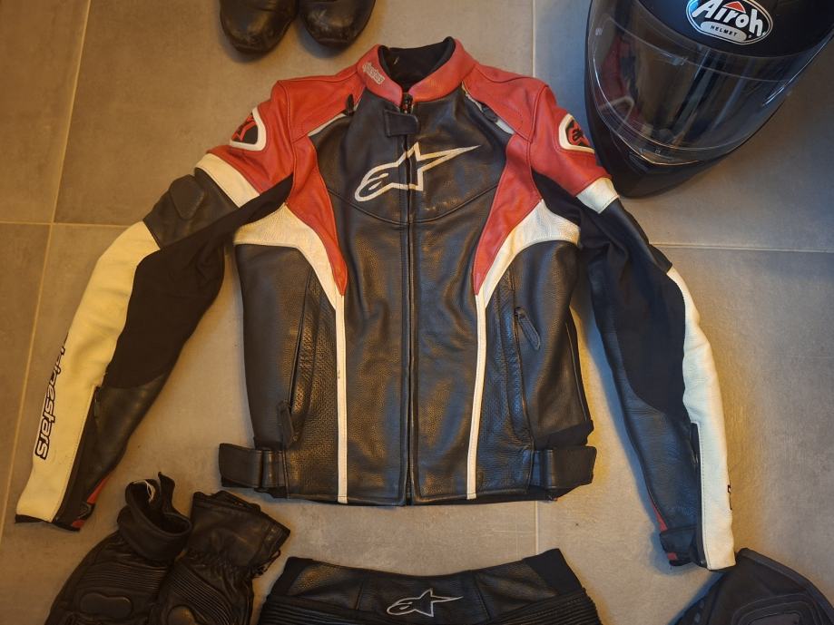 Alpinestars jakna in hlače št. 40, Büse ledvični pas št. L in rokavice št. 7, škornji Road št. 40, čelada Airoh št. S, motoristične jeans hlače št. 4. Rabljeno. Za konfekcijsko št. xs-s.