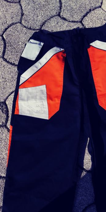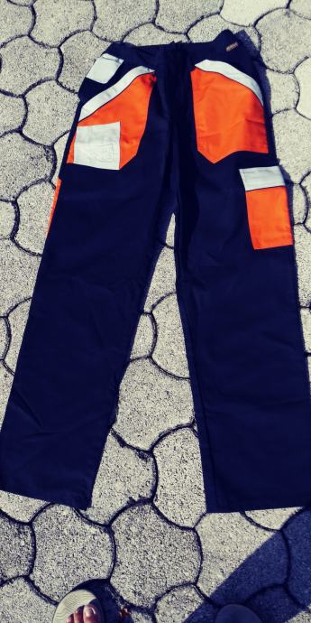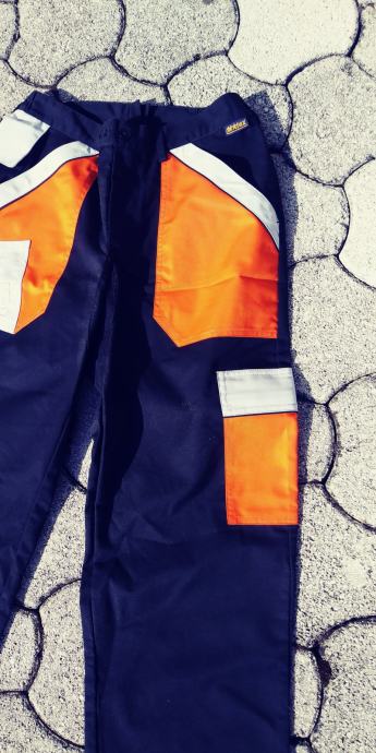 Hlače so nove. Velikostna številka je 50. Izdelane so iz kvalitetne tkanine. Osnovna barva je črna, kombinacija pa oranž in svetlo siva.
