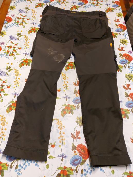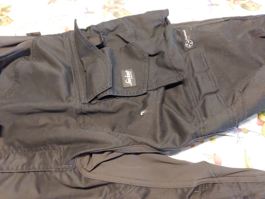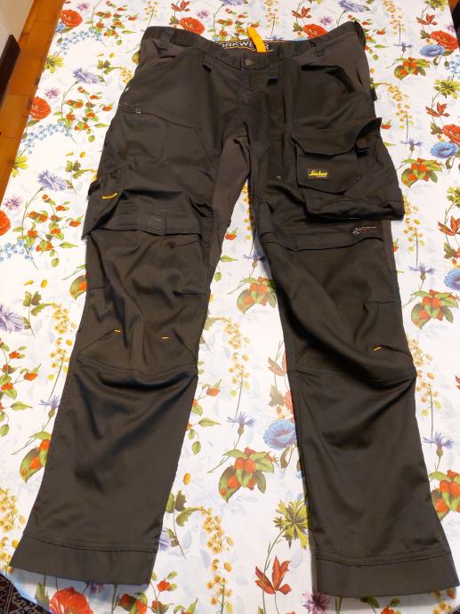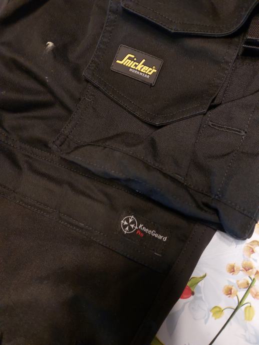Delovne hlače Snickers, oprane, številka 58. Nekaj madežev, ki se ne operejo z običajnim pranjem (glej slike), kar pa za delovne hlače niti ni važno. Drugače brez poškodb in z zelo ugodno ceno za kvalitetne hlače.