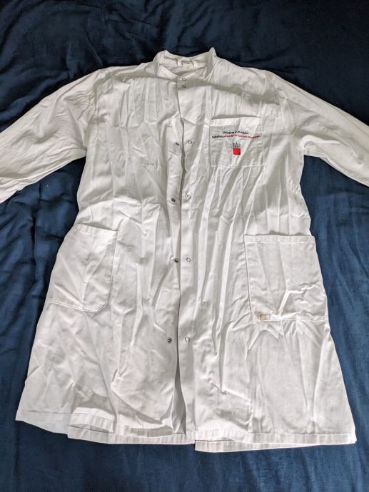 Prodajam rabljeno moško belo laboratorijsko haljo. Dobro ohranjena, z izjemo nekaj drobnih madežev. S FKKT. Št. 54, dolžina rokava 53 cm.