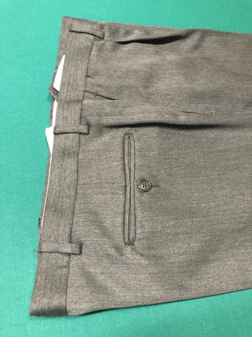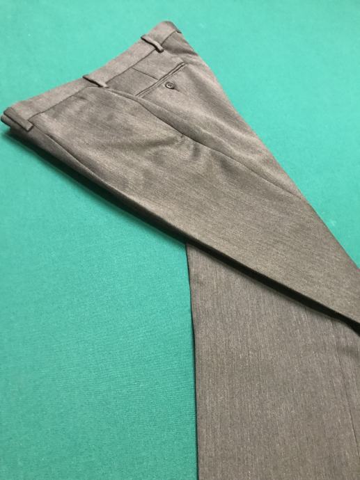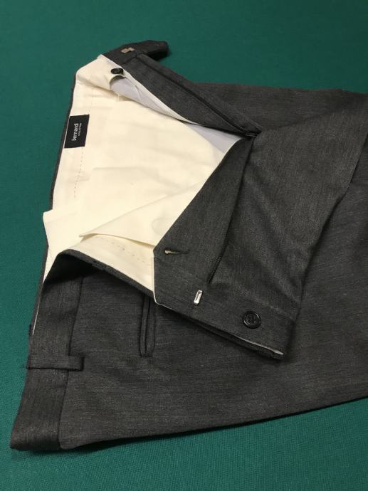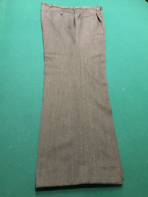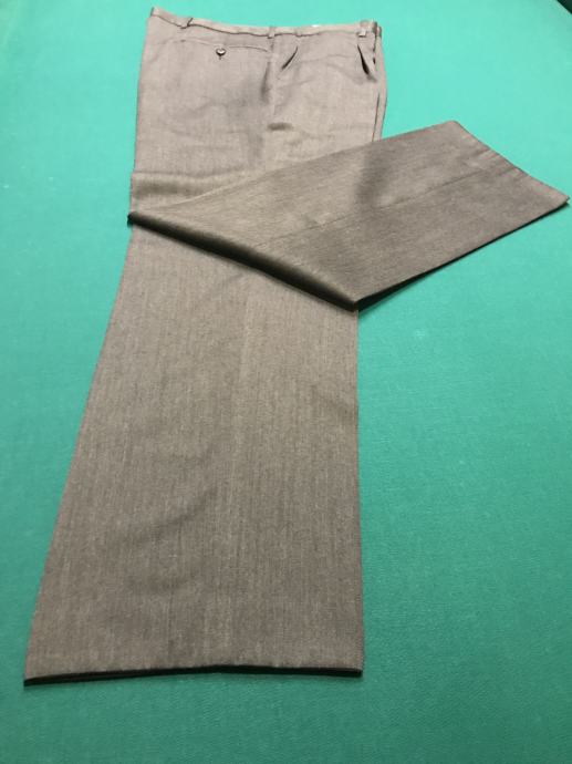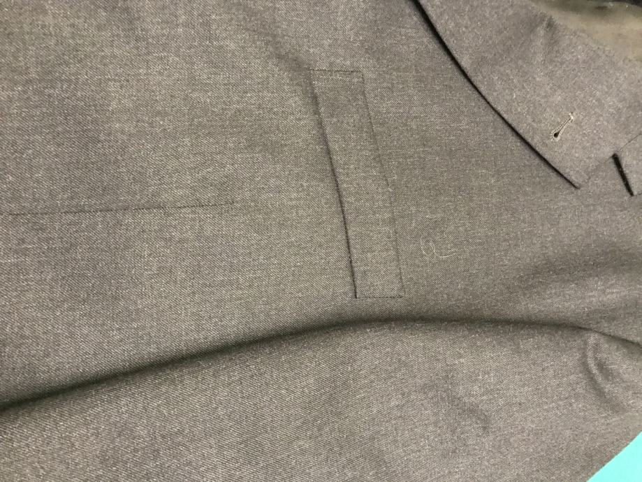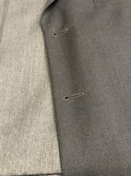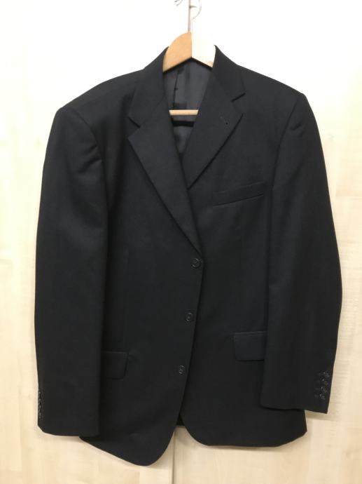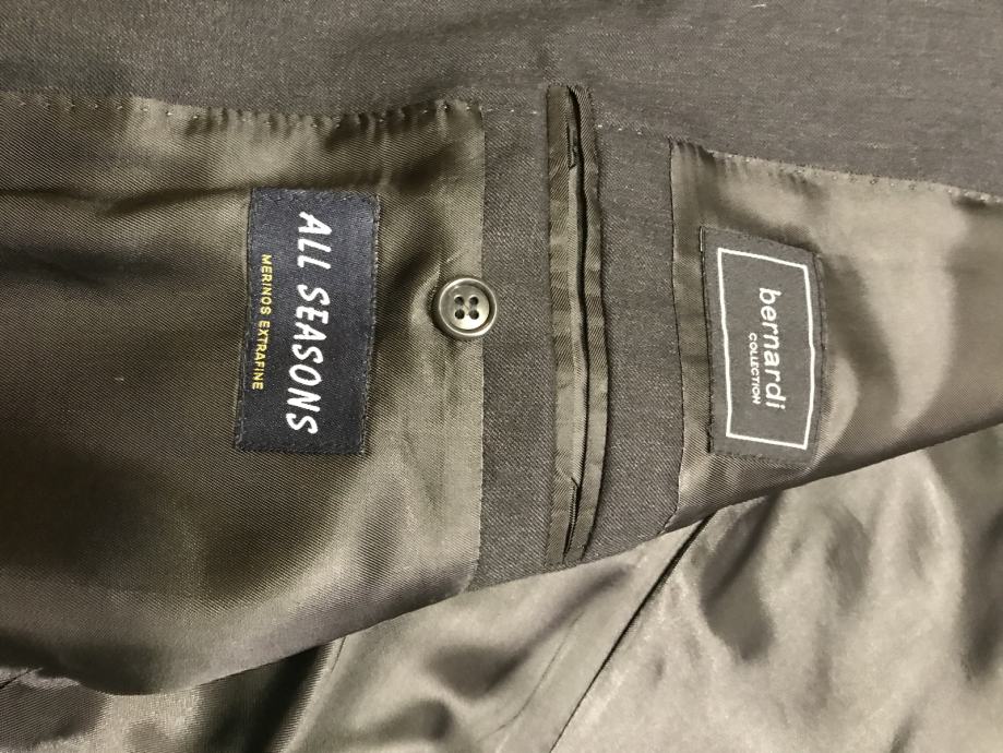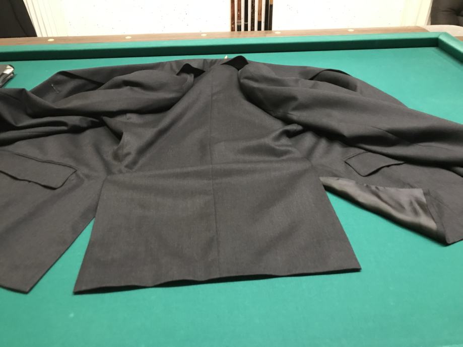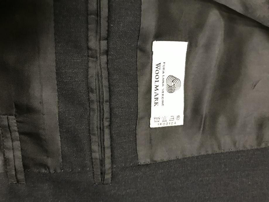 Velikost je št. 54. Suknjič ima zadaj 2 stranska razporka. Hlače so klasičnega kroja. Dolžina hlač je 102 cm, obseg pasu pa 96 cm. Material ćista volna. Obleka ni bila rabljena je kot nova.