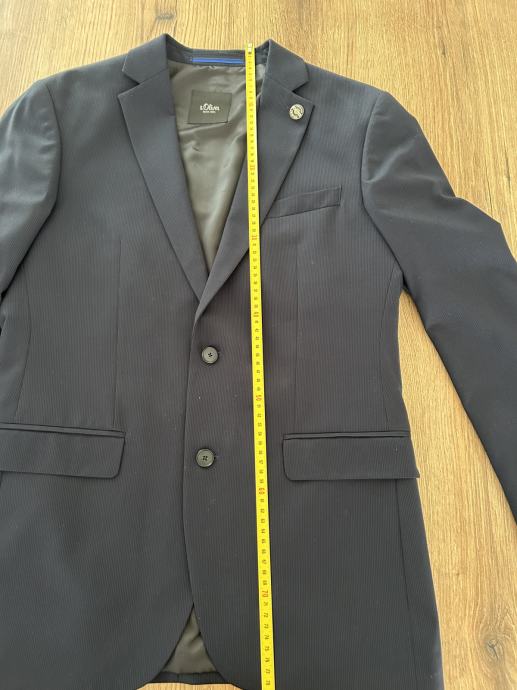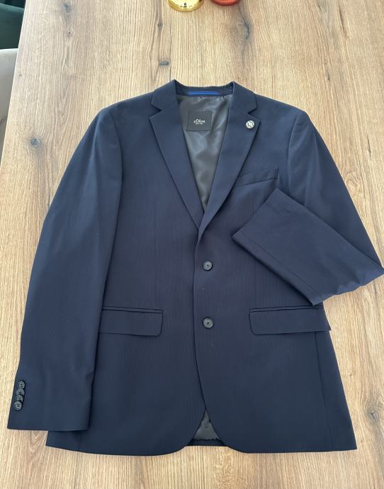 Moška temno modra obleka (sako + hlače) in bela srajca. Oboje je znamke S.Oliver black label, primerna za številko S/M. Nošena 1x, fant je visok 175cm, nosi M številko in mu je prav.