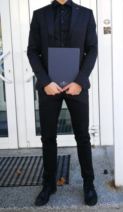 Prodajam komplet: Hlače, 2 srajci (črna in siva - izjemno kakovostna, raztegljiv material), jopič, kravata. Lahko se dogovorimo tudi za čevlje na sliki.