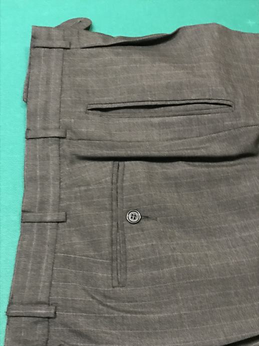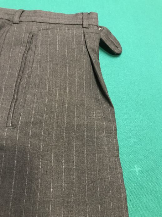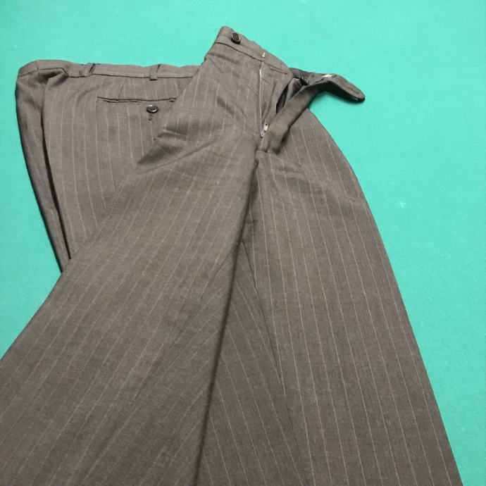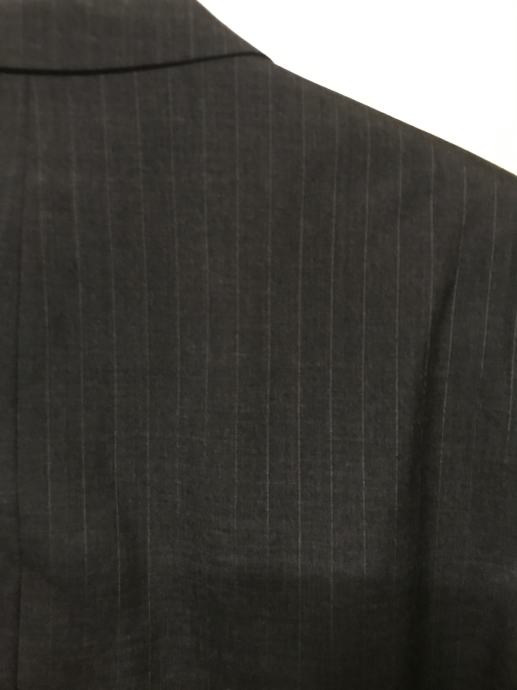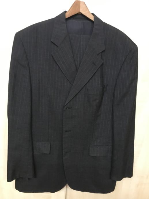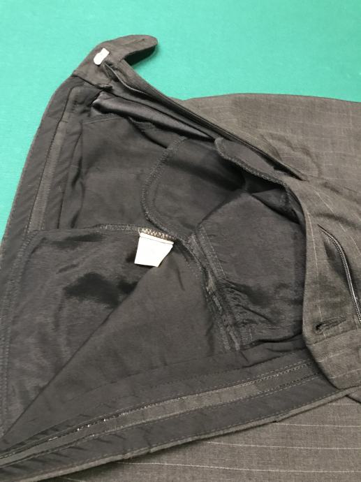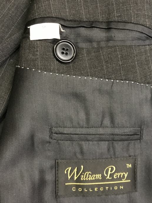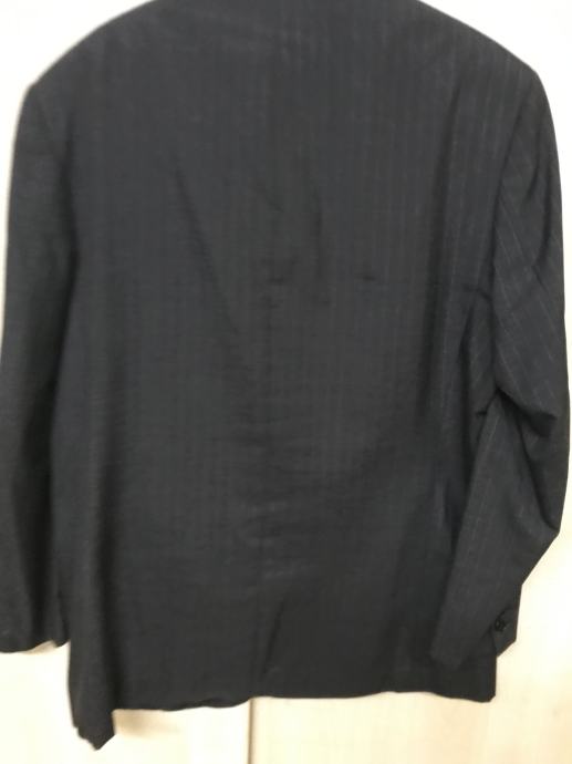 Na voljo je temno siva moška obleka s svetlo sivimi črtami. Zelo elegantna. Material je mešanica volne in viskoze. Suknjič zadaj nima razporka. Hlače imajo v pasu izvedene naborke. Velikost št. 54. dolžina hlač100 cm, širina v pasu 98 cm. Udobna in elegantna. Rabljena a zelo lepo ohranjena.