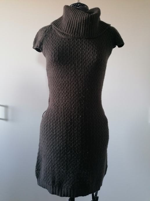 Pletena obleka v barvi temne čokolade. Kratki rokavi, ob straneh ima zanki za pas.