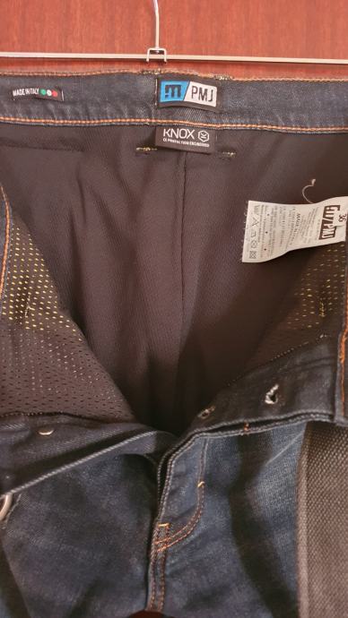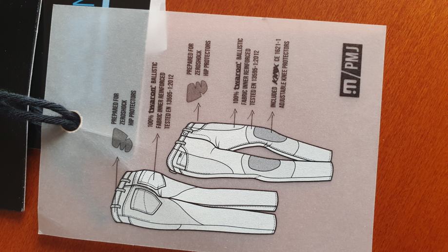 Prodaja se vrhunska zaščita PMJ moto jeans hlače z odstranljivo zaščito kolen.Hlače spadajo v vrh zaščite z izrazito močnim ( twaron ) materialom.Imajo COOLMAX PRO podlogo za ohranjanje toplote in svežine.Zraven je original pas.Hlače so kupljene v Italiji-Duino-Sistiana Moto racing.Zaradi zdravstvenih težav bile le par krat oblečene (trgovina+ vožnja domov+cca 700 km). Podaljšan kroj št 50 .Hlače so kot nove,zraven še nepremočljiva torba za shranjevanje.Ogled v Piranu,pošljem tudi po pošti.