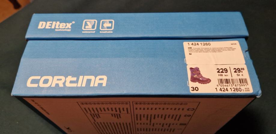 Prodam nove, nikoli obute zimske cevlje za fantka vel. 30. Notranjost topla, vodoodbojni, noga diha. Blagovna znamka Cortina. Temno modre barve.