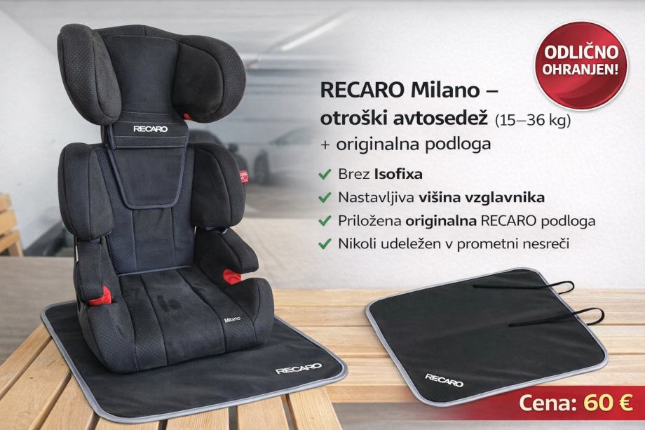 Prodam otroški avtosedež Recaro Milano brez (ISOFIX-a) z originalno podlogo.