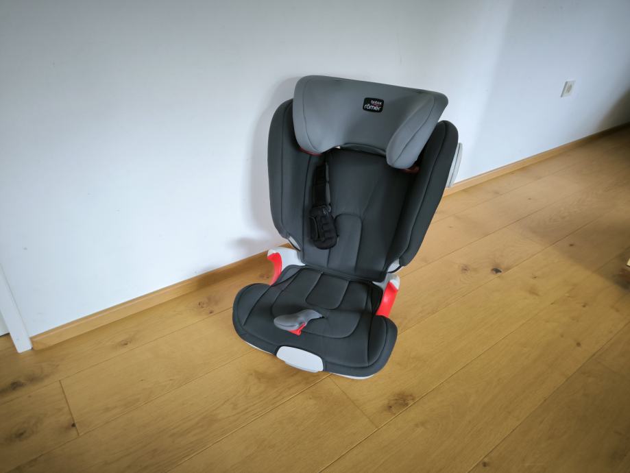 Sedež ima ISOfix pritrdilne nosilce, dodatno pritrdilo za varnostni pas med nogami otroka in stranske nastavljive distančnike. Sedež je sive barve in opran.