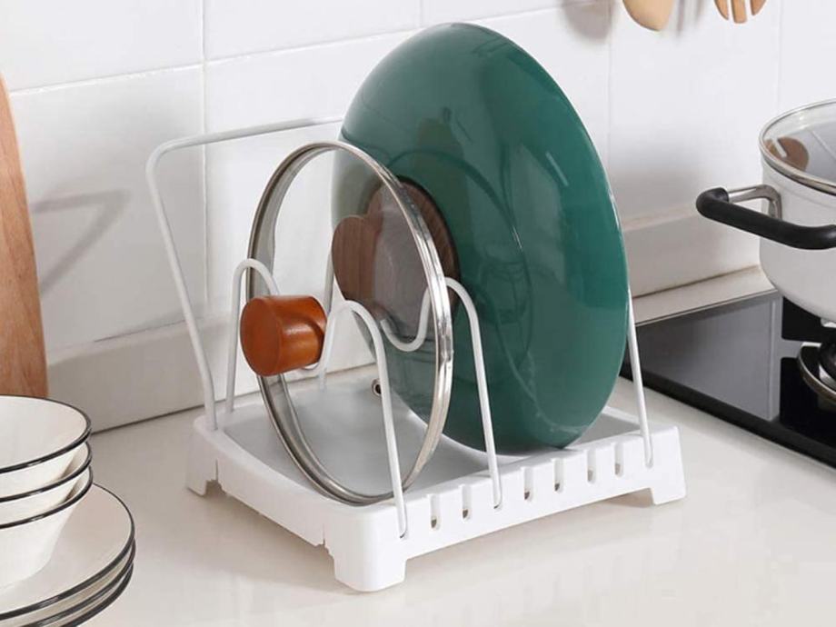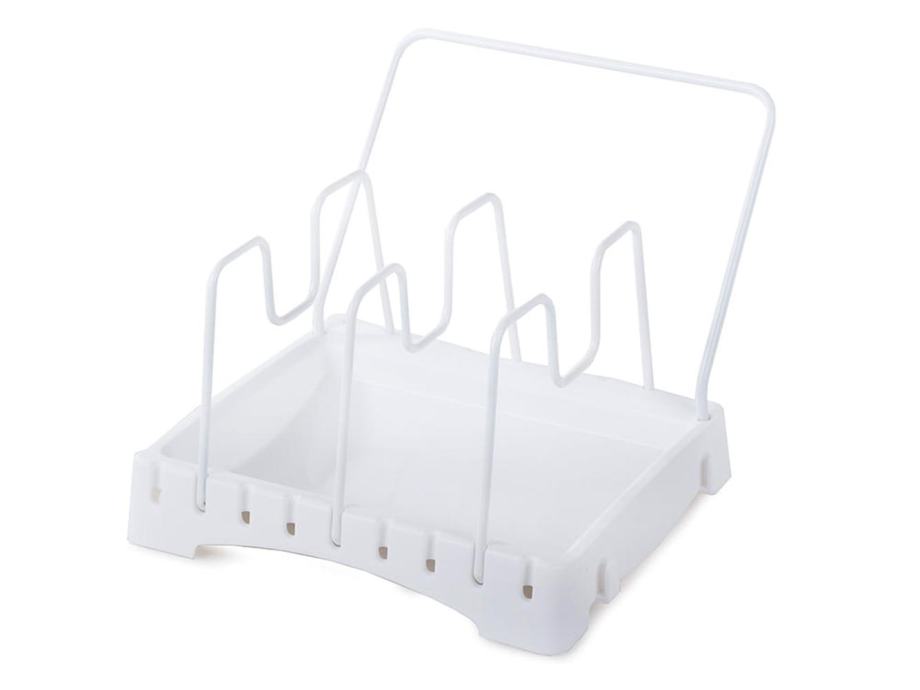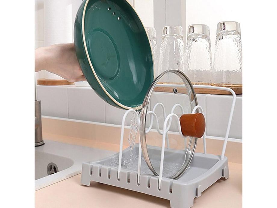 V sušilnem stroju boste lahko organizirali različne kuhinjske dodatke, kot so pokrovi za lonce, ponve, lonci, deske za rezanje, posode, pekači itd. Stojalo je opremljeno z odcejalnikom, zahvaljujoč kateremu se lahko kuhinjski pripomočki po pranju neovirano posušijo pred jih hranite v omari.