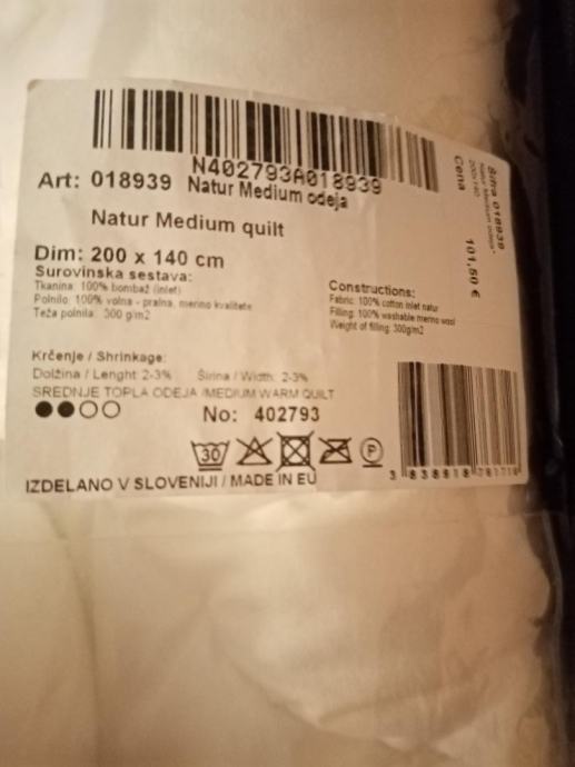 Prodam odejo Odeja Merinofil Medium (slovenski izdelek Odeja). Srednje topla, polnjena z merino volno, nerabljena, 200x140 cm