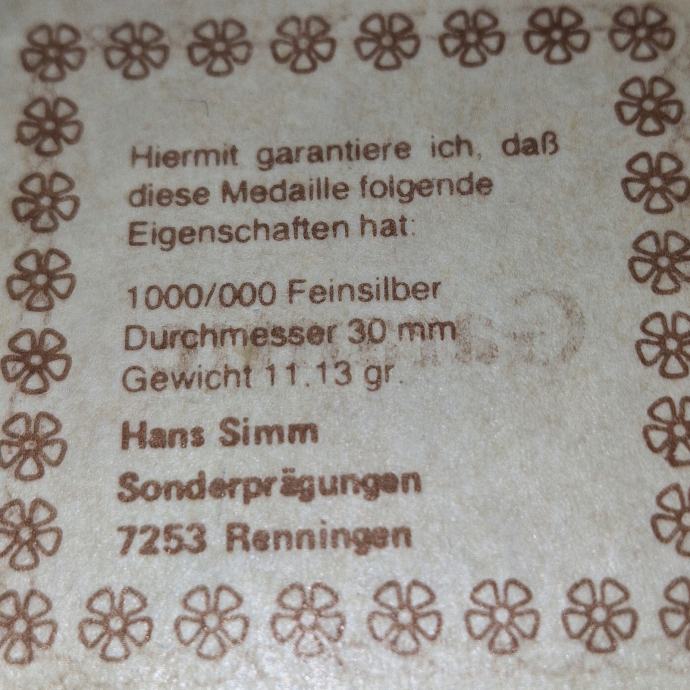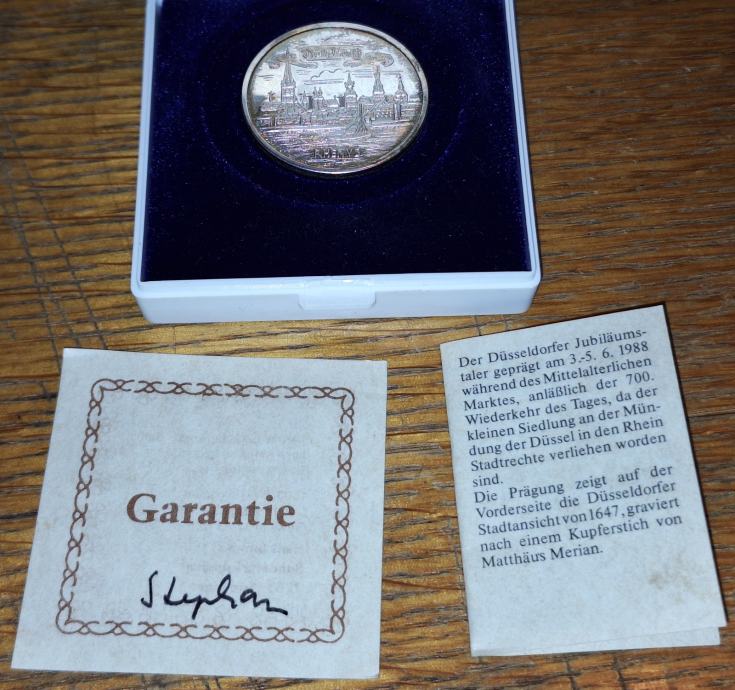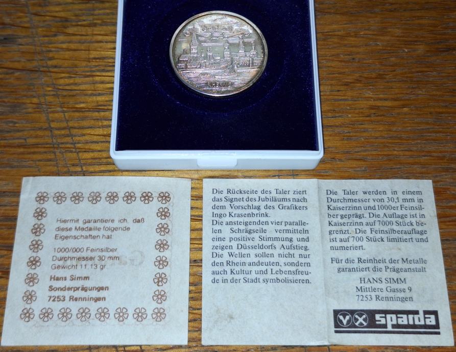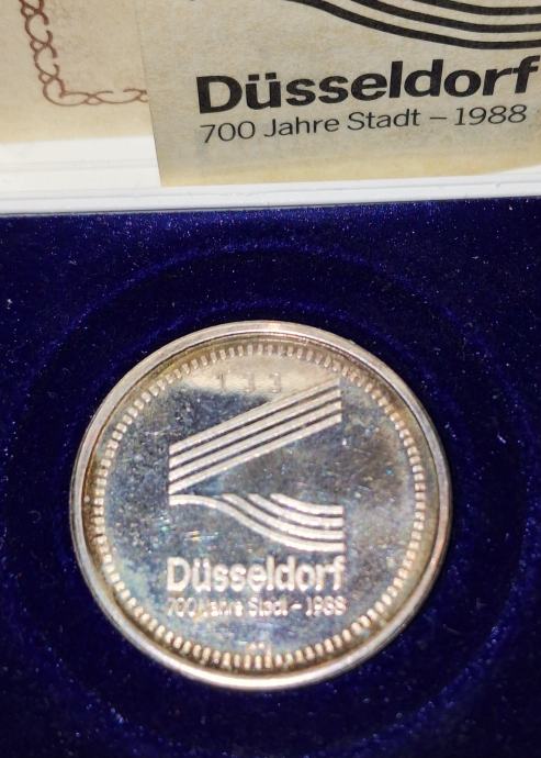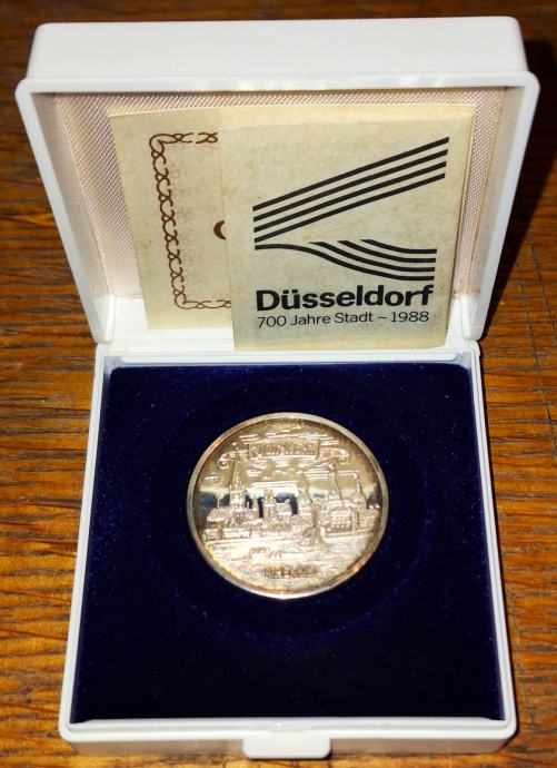 Prodam srebrno medaljo 700 let mesta Düsseldorf iz leta 1988, premer medalje 30 mm, material čisto srebro 1000, teža 11,13 gr. Medalja je v zaščitni škatli s pripadajočim certifikatom. Narejeno je bilo 700 medalj iz čistega srebra in te medalje so tudi oštevilčene, ta ima št. 133.