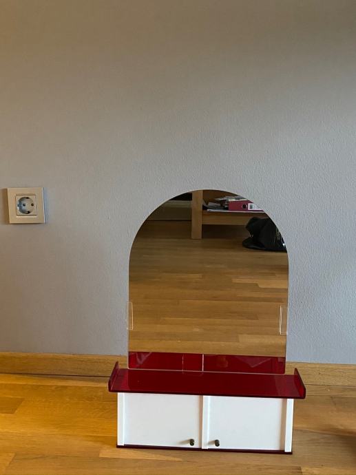 Ogledalo s predalom, novo, zelo poseben design. Mere skupaj s predalom so:višina 45, širina 35 cm, mere samega ogledala so 35x30 cm. Predal se odpira z vraticami z gumbki kot razvidni na fotografiji.