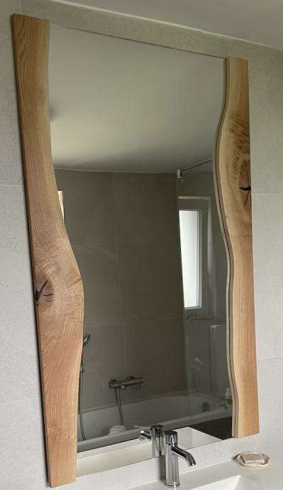 Novo stensko ogledalo z hrastovim robom. Lesen del je zaščiten z oljem ( primerno tudi za v kopalnico). Na voljo v različnih dimenzijah po naročilu. Poleg tudi šablona in vijaki za montažo. Možno tudi z led osvetlitvijo.