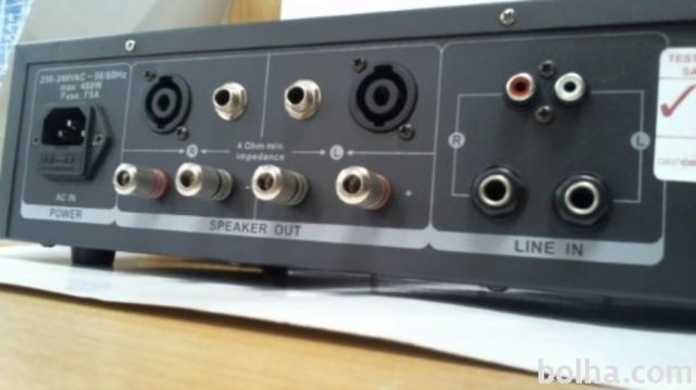 Ojačevalnik zmore 2x240W RMS/4ohm, oziroma 2x120W RMS/8ohm.
