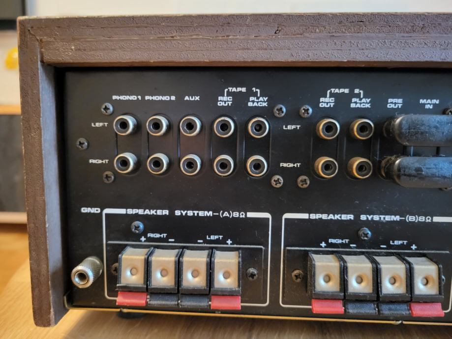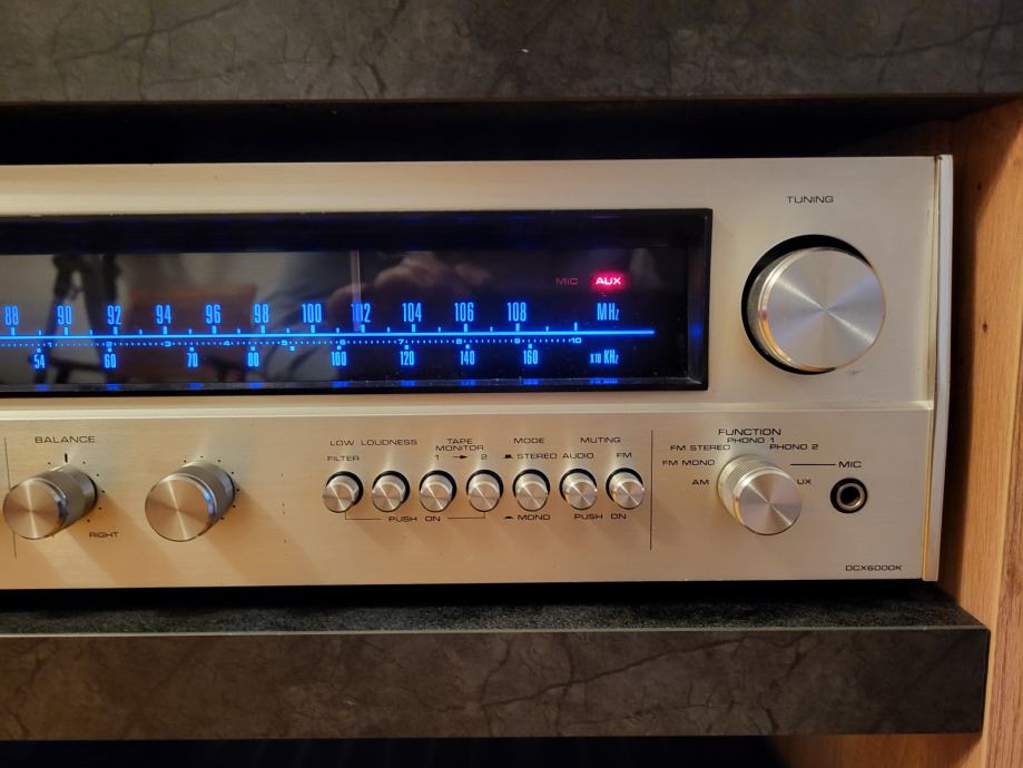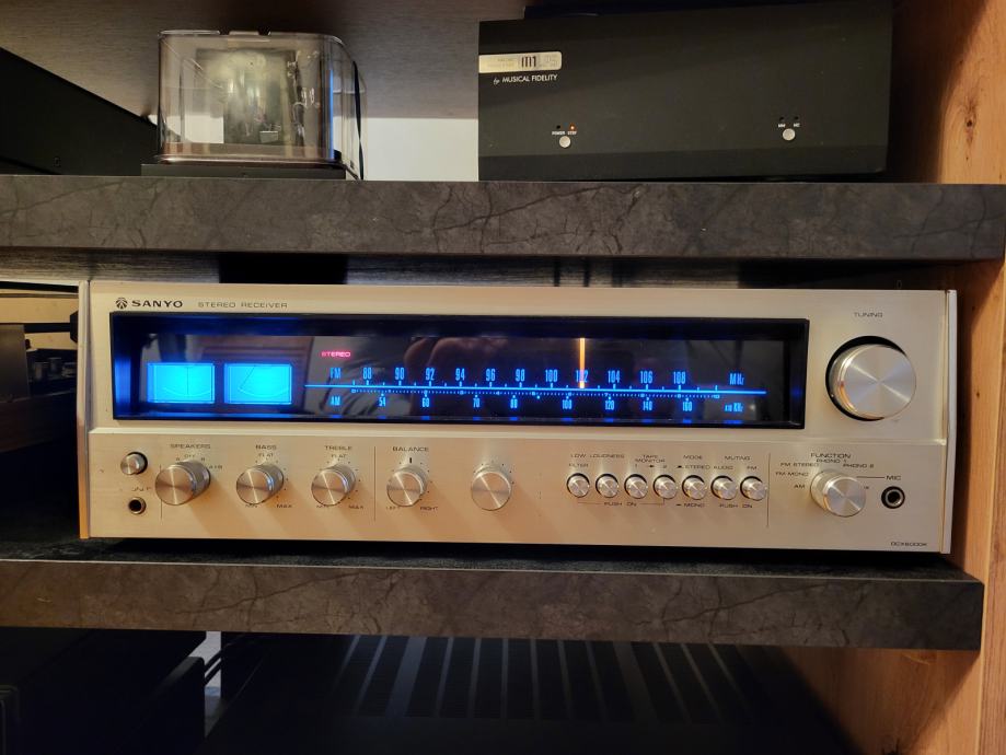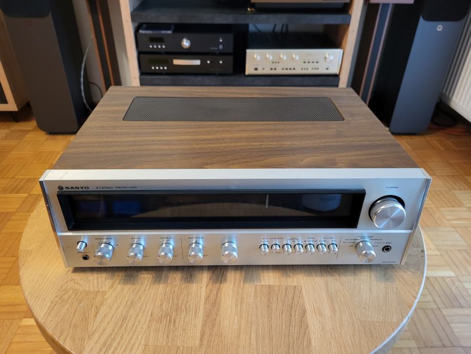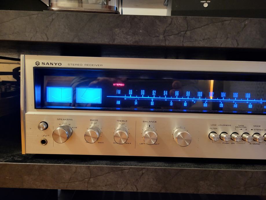 Zelo lep vintage Receiver, prodam. Želite zelo lep zvok in ob tem istočasno svetlobno atraktiven izdelek v vaši HiFi omari ali polici, posebno v temi, potem je Sanyo prav za vas. Ima vse potrebne analogne vhode. Celo 2 odlična PHONO vhoda. Vsi delujejo brezhibno in brez šumenja. Vse dela odlićno razen FM tunerja ki se sliši dosti slabo (AM tuner je brezhiben). Ker Receiver uporabljam kot ojačevalec tega niti ne pogrešam. Napako se da odpraviti (potrebna zamenjava nastavljivih tuljav FM sprejemnika), vendar ne vem za ceno. (zadnji 2 sliki).