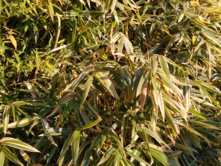 Hibanobambusa Tranquillans 'Shiroshima' - Nizka vrsta z okrog centimeter debelimi stebli. Močno povešava z ogromnimi izredno atraktivnimi, obarvanimi listi. Možno jih je oblikovati v živo mejo ali obrezovati v različno visoke bambusove grmičke.
