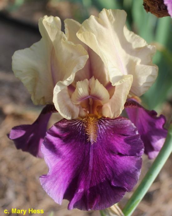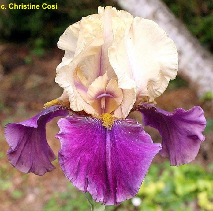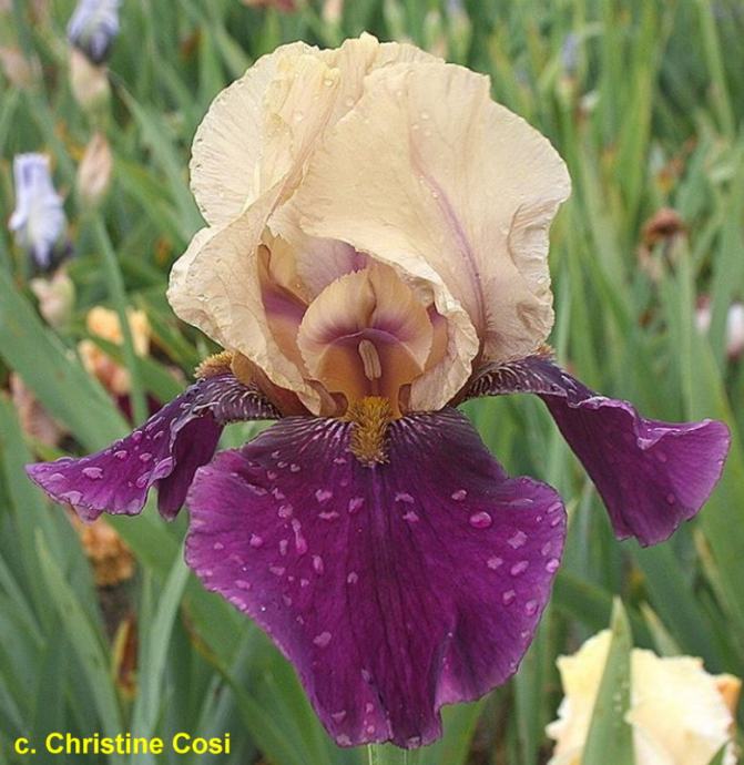 Visoka bradata perunika (Iris germanica) 'Comanche Drums' se ponaša s cvetovi v privlačni barvni kombinaciji - zgoraj so krem, spodaj pa vijolični (glej sliko). Cvetovi so na robu rahlo valoviti. Žlahtnitelj Tompkins (ZDA). Več informacij o sorti: https://wiki.irises.org/TbAthruE/TbComancheDrums