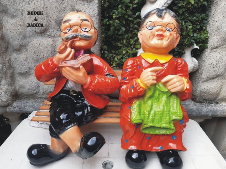 DEKORATIVNA FIGURA DEDEK IN BABICA. MATERIAL: POLYRESIN - UMETNA MASA. VIŠINA 63 CM, KLOP IZ LESA - 75 CM. FIGURA JE KVALITETNO IZDELANA. PRIMERNA ZA NOTRANJO, KOT ZUNANJO DEKORACIJO DVORIŠČE, VRT....