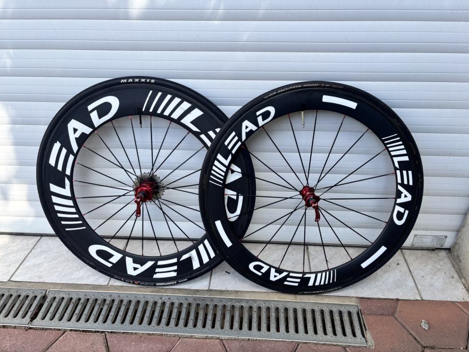 LEAD komplet koles za kronometer, za tubularje, 90mm zadaj, 60mm spredaj, klasične zavore. Uporabljani samo na dirkah, lepo ohranjeni, tubular Continental Competition in Maxxis, kaseta 11 redna Shimano Ultegra, 11-23.