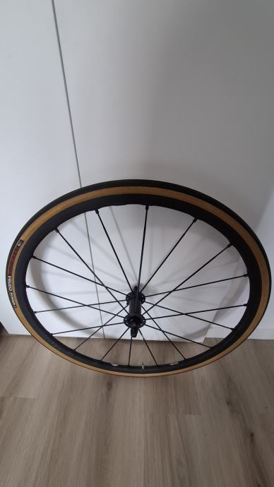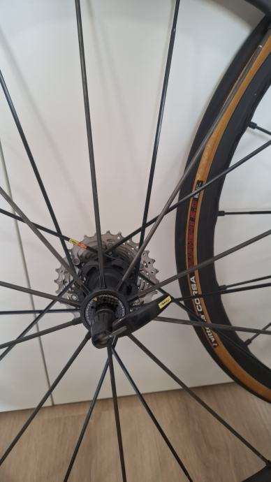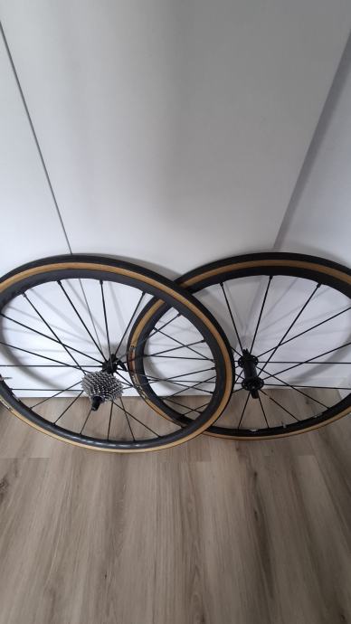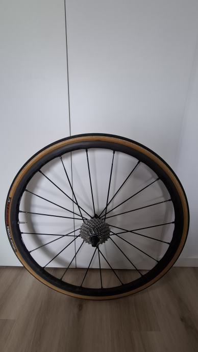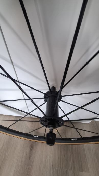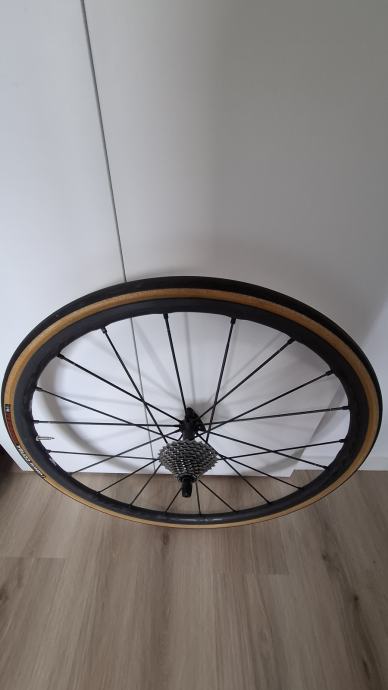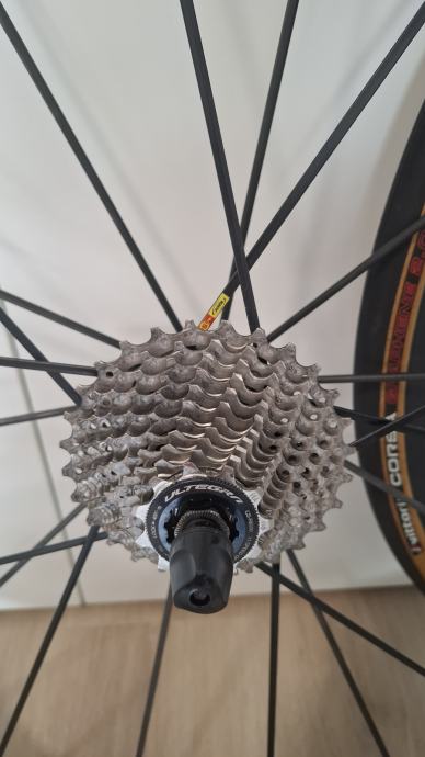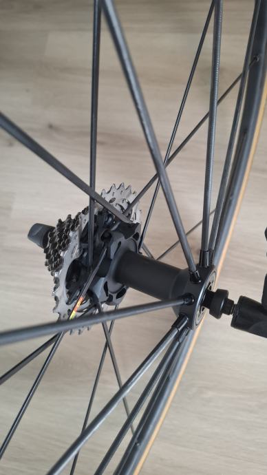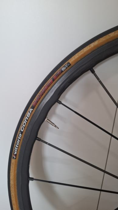 Na obročih so nameščeni plašči Vittoria corsa 2.0, širine 28 mm. Na zadnjem obročniku je nameščen verižnik Shimano Ultegra 10-28.