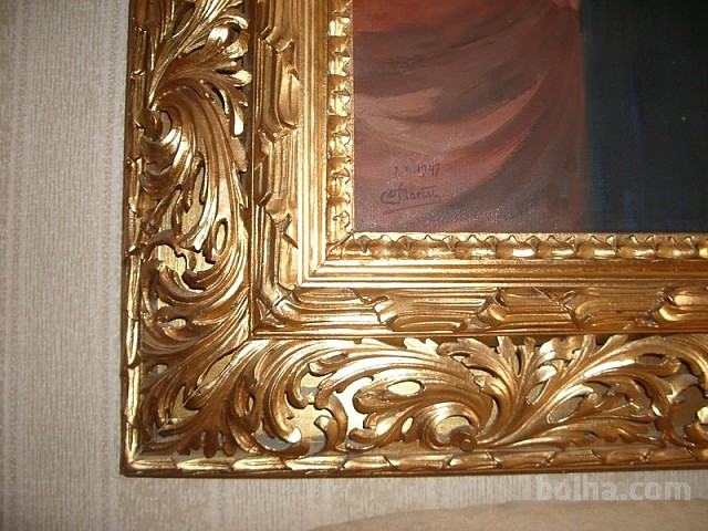 Stari izrezljani leseni okvir, pobarvan v zlatu -idealen za portret ali ogledalo Višina-165 cm, Širina -108 cm, Višina samega portreta - 126 cm Širina samega portreta - 70 cm. Samo okvir se prodaja.