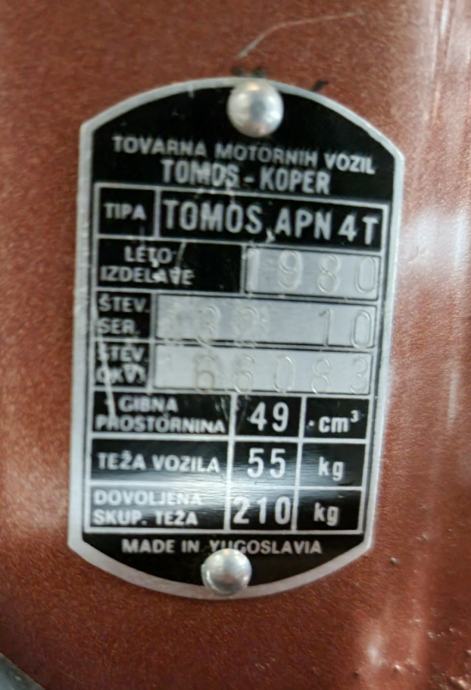 Prodam motor TOMOS APN 4T, rjave kovinske barve, letnik izdelave 1980, serijska št. 3210, 1. Lastnik, SLO poreklo, v brezhibnem stanju, garažiran, nikoli v registru.